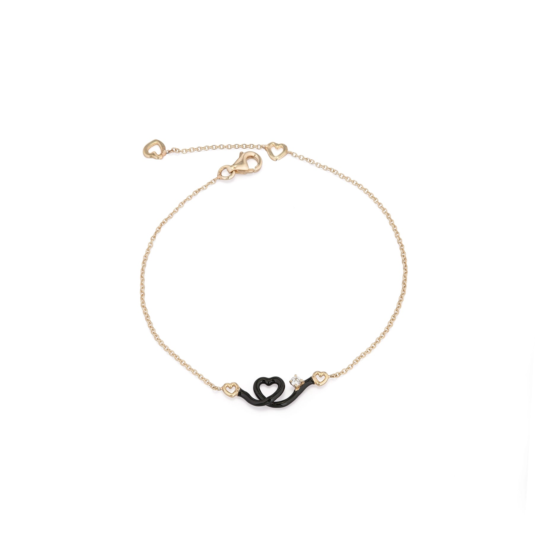 Gold bracelet with a heart-shaped pendant, hand-painted with black enamel and accented by a round-cut diamond.