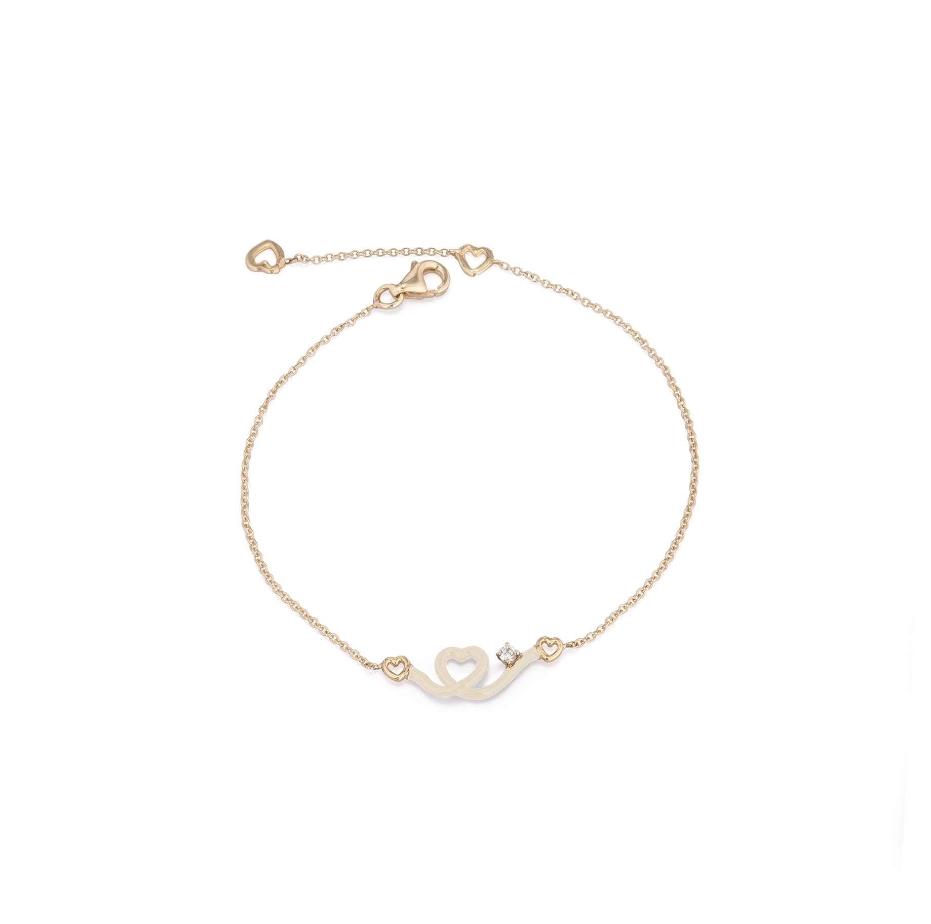 Gold bracelet with a heart-shaped pendant, hand-painted with panna enamel and accented by a round-cut diamond.