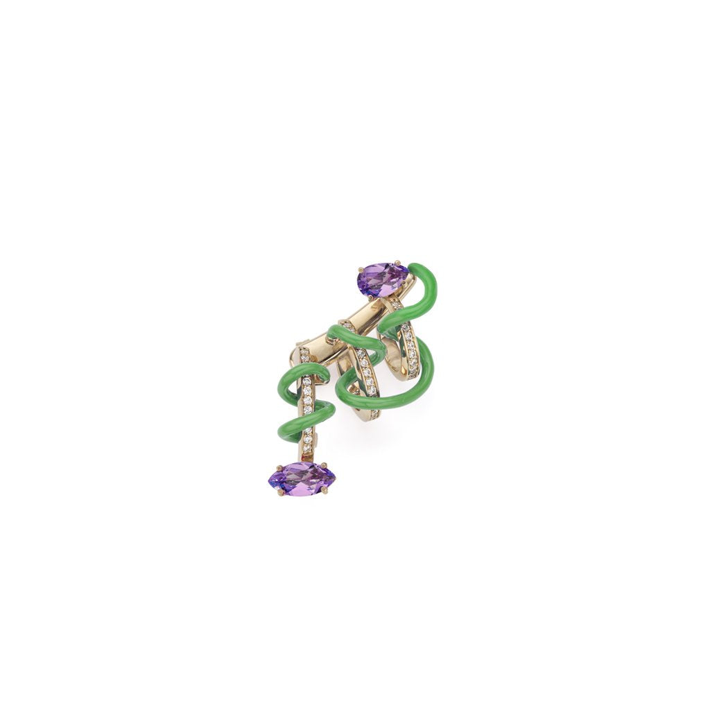 Short Crawler Vine Ear Cuff in 9kt yellow gold and silver with green enamel, marquise and drop cut amethysts and white diamond pavè.