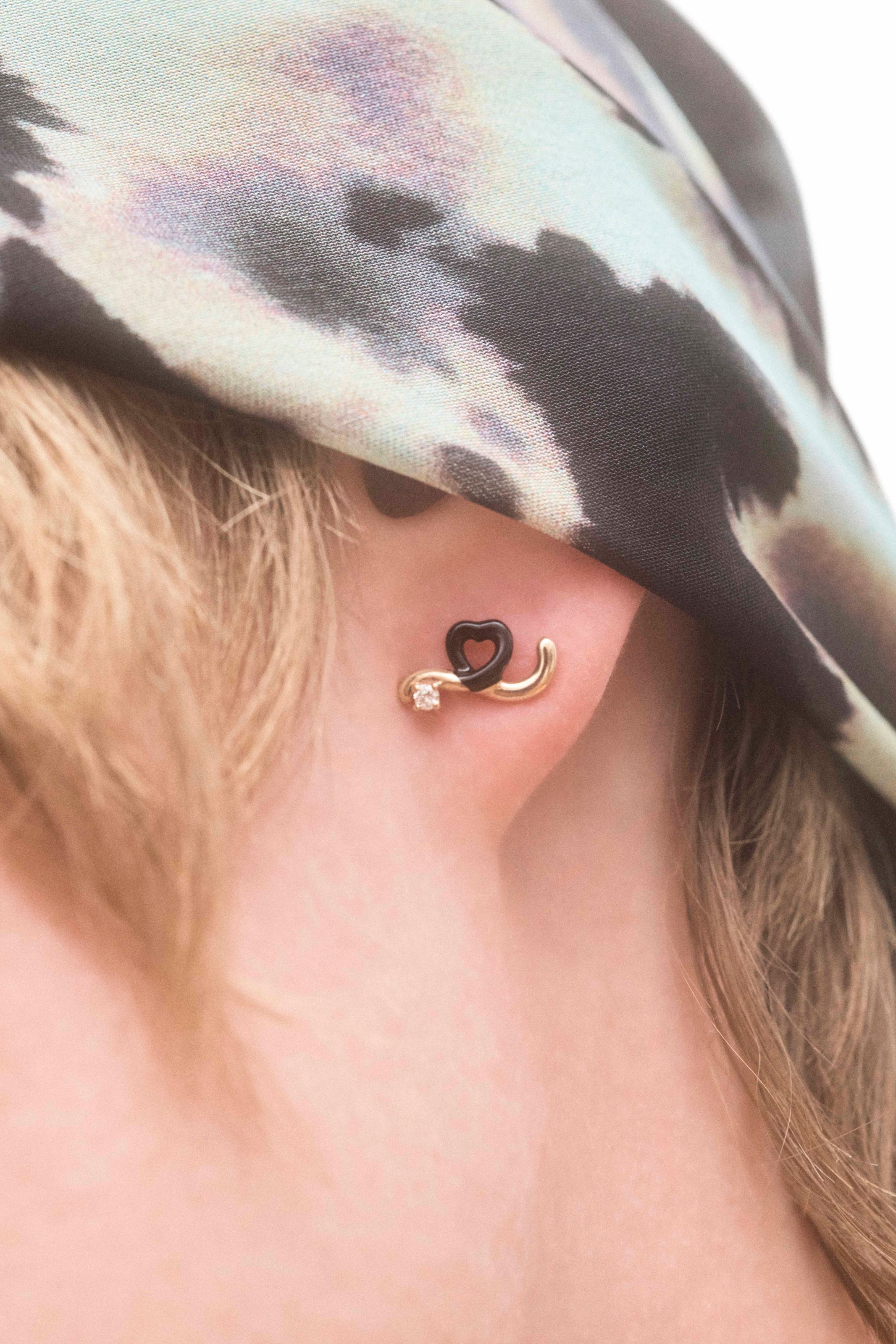 Baby heart single earring in yellow gold, featuring black enamel and round-cut diamond.