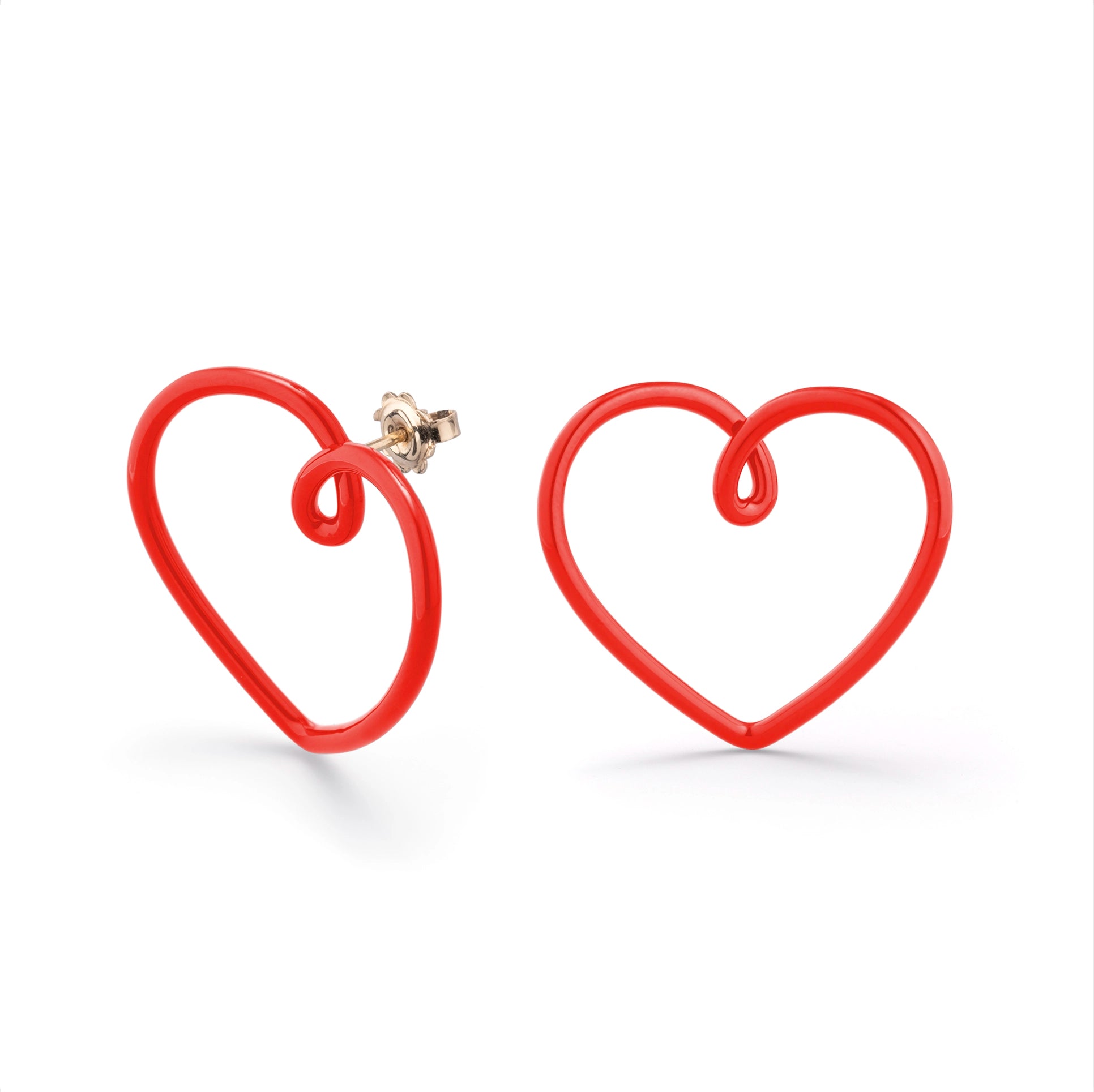 Heart-shaped earrings in silver and gold with hand-painted red enamel.