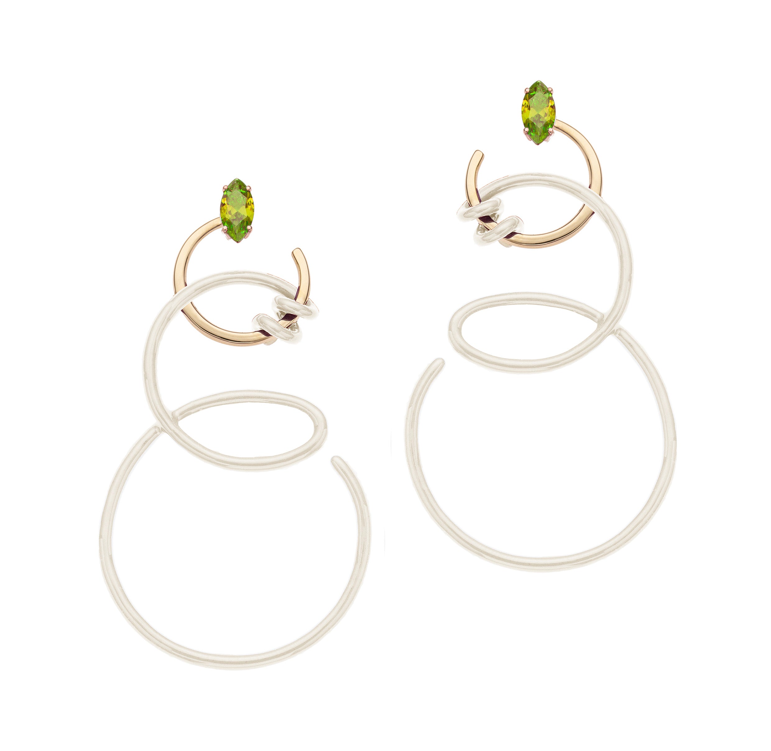 Double curl vine pendant earrings in silver and gold, featuring panna enamel and marquise-cut peridots.