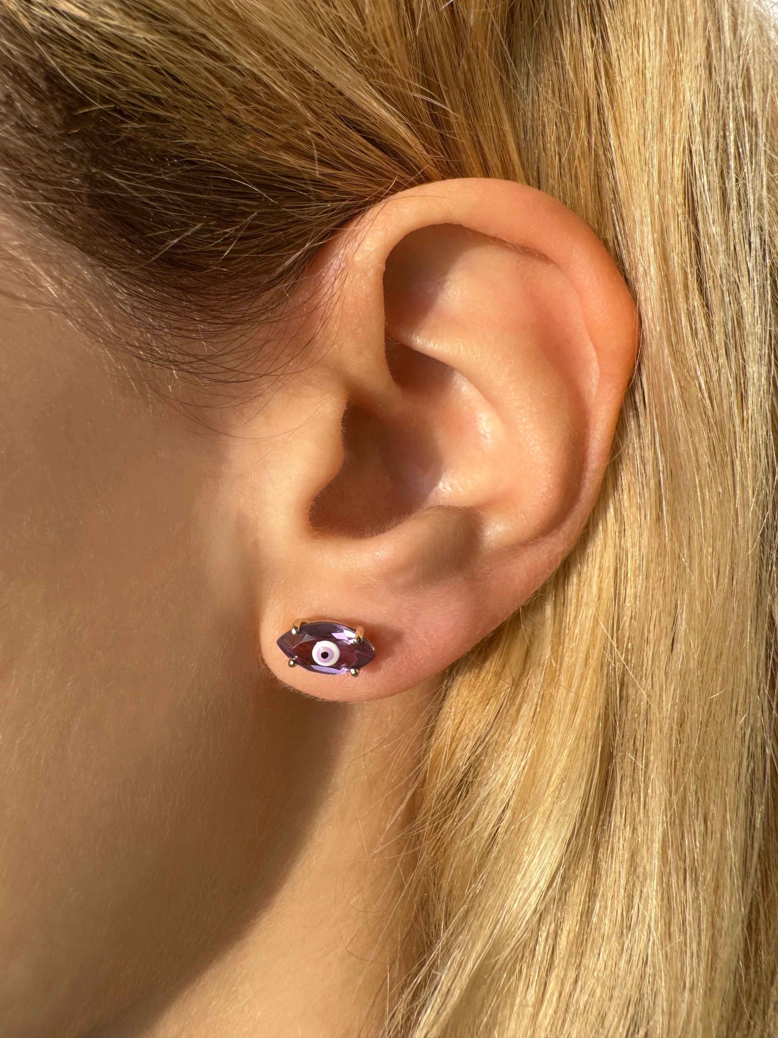 Drawing inspiration from the iconic symbolism of the Evil Eye, cherished across diverse cultures since ancient times, this Fortuneye single earring features a marquise-cut amethyst with an innovative hand-painted eye directly onto the gemstone in hues of wisteria, black, and white enamel. Wearing this purple amulet promotes balance and inner peace.
