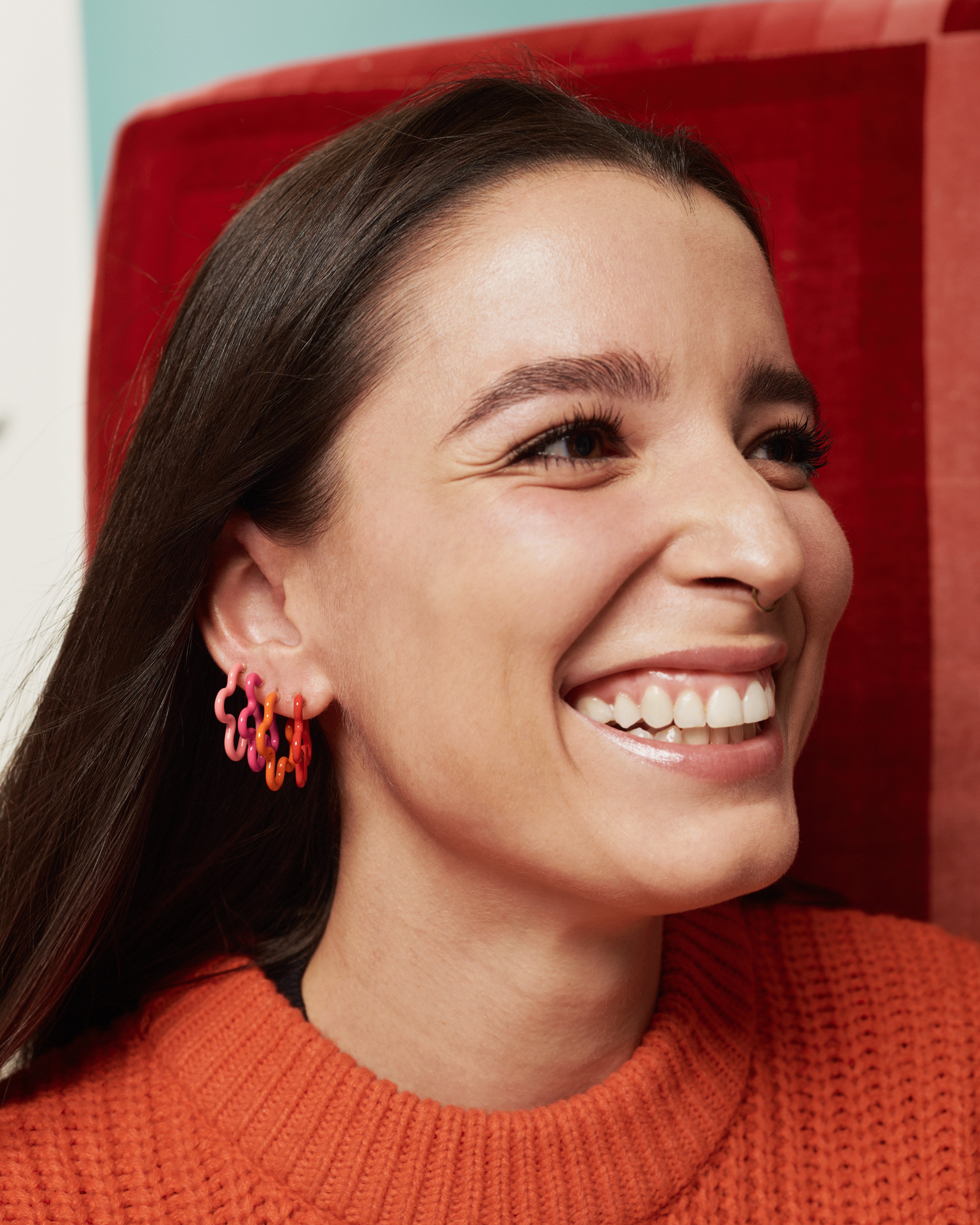 These 2-tone earrings feature a flower design in red and japanese orange.