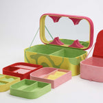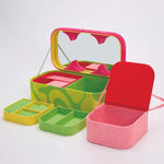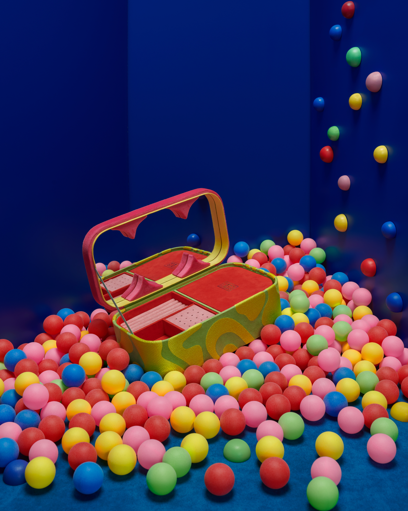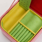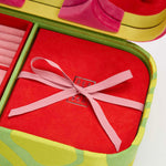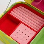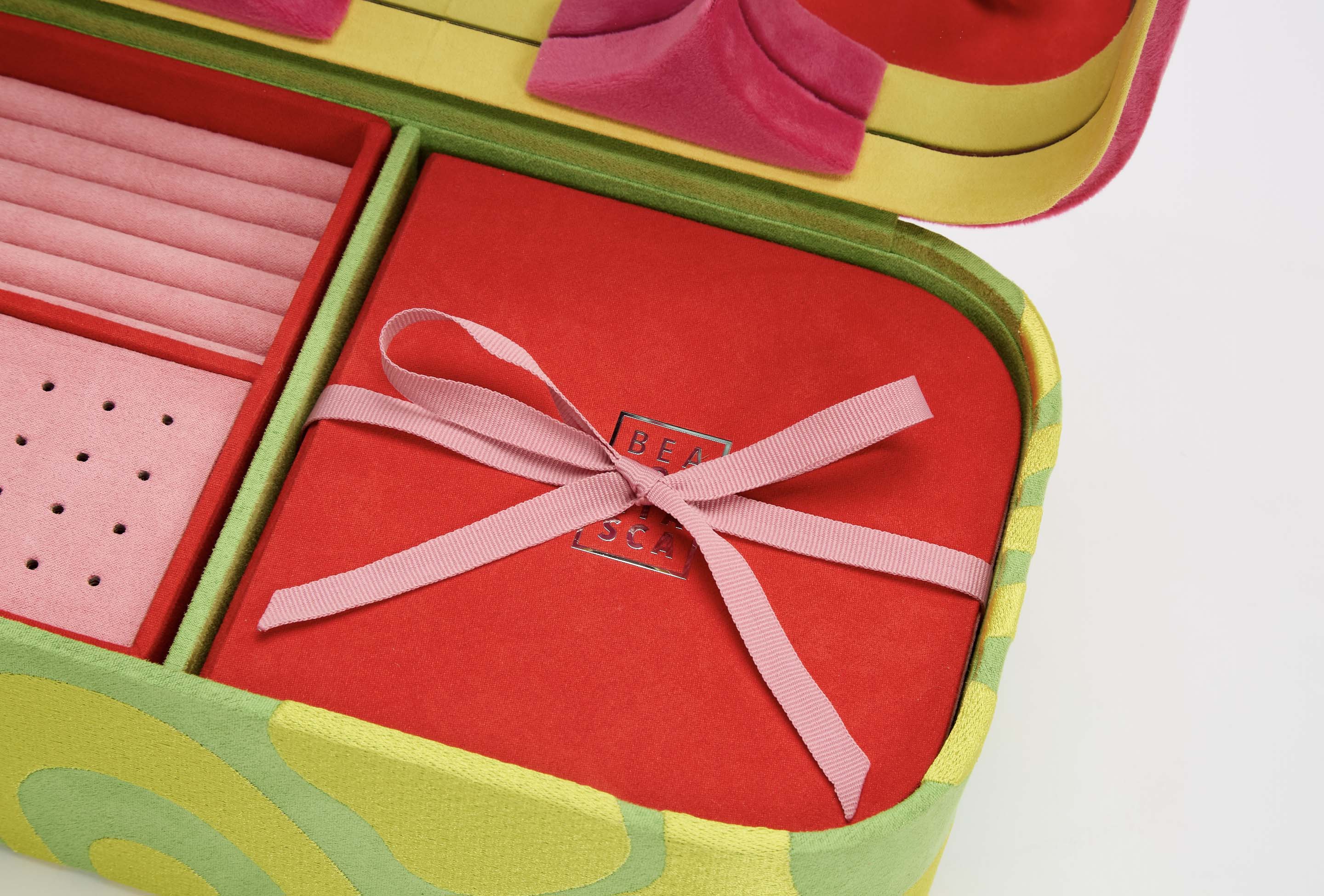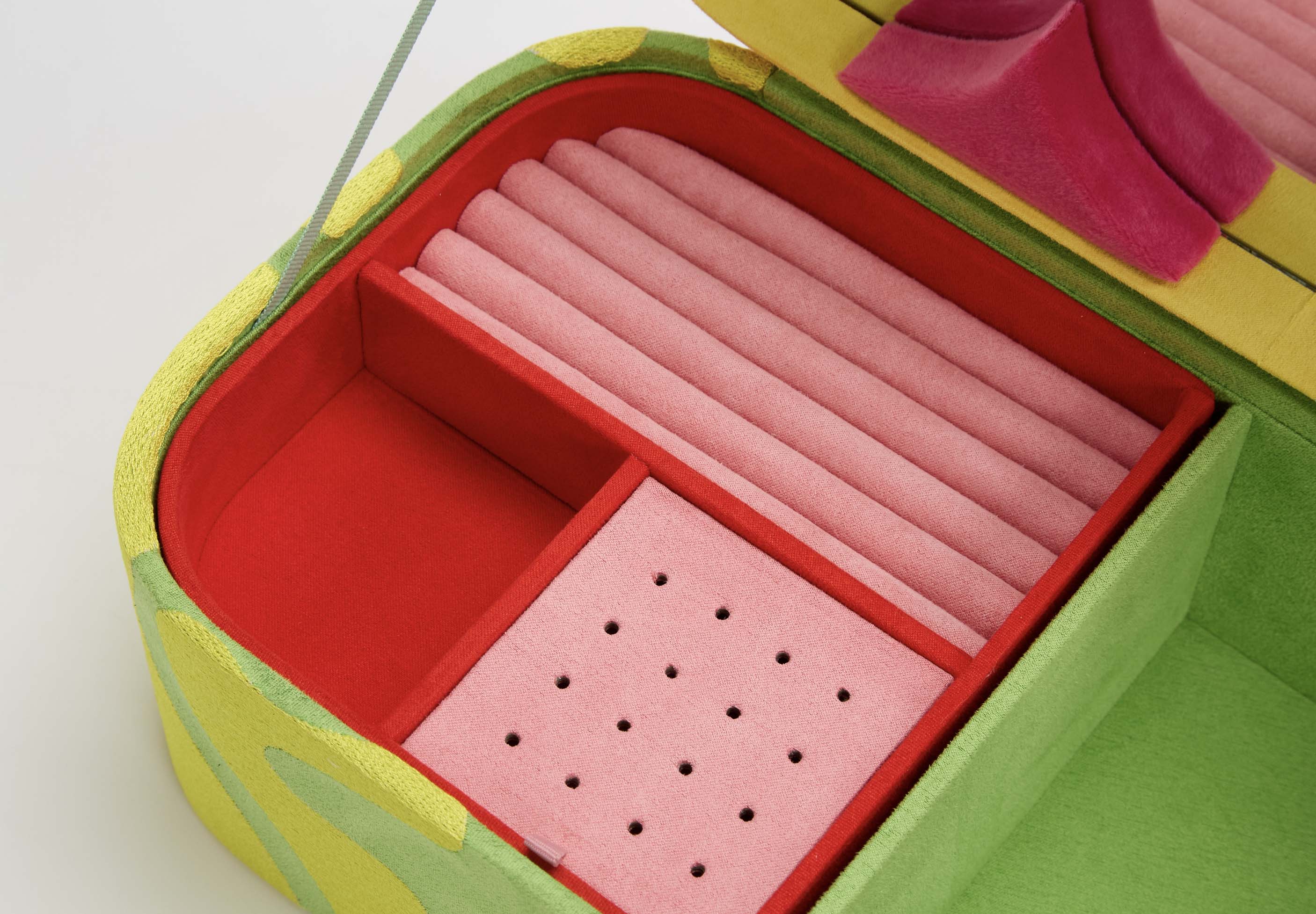 Inspired by the seventies swagger, this Large Box in Microsuede is made in Green and Red Microfiber with Pink Velour and Embroidered Yellow patterns. It has a removable travel box inside, with two trays.