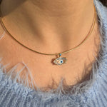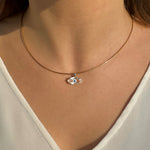 Fortuneye necklace in gold features a marquise-cut rock crystal with hand-painted eye directly onto the gemstone in hues of turquoise, black, and white enamel.