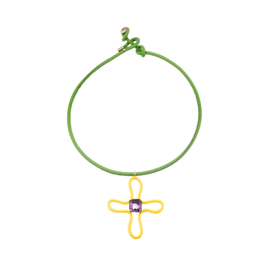 Pop Choker in yellow gold and silver with a Lucky Flower pendant featuring an octagon-cut amethyst and yellow enamel, paired with a green leather cord.