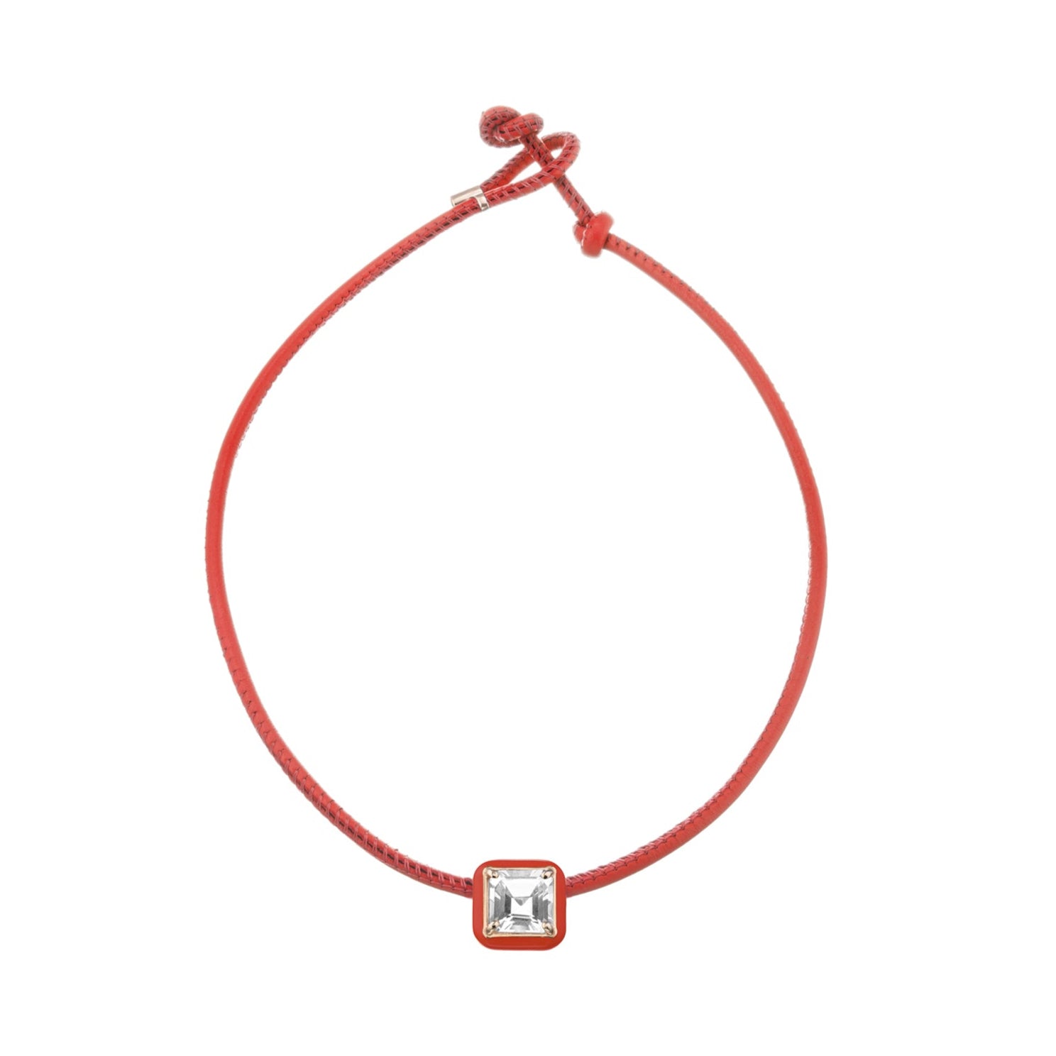 Pop Choker with Square in Candy Setting in yellow gold and silver with square cut rock crystal and red enamel with adjustable red leather cord.