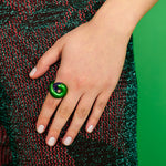 Tarallo ring in silver, featuring hand-painted glossy green and black enamel detailing inspired by a Hognose Snake.