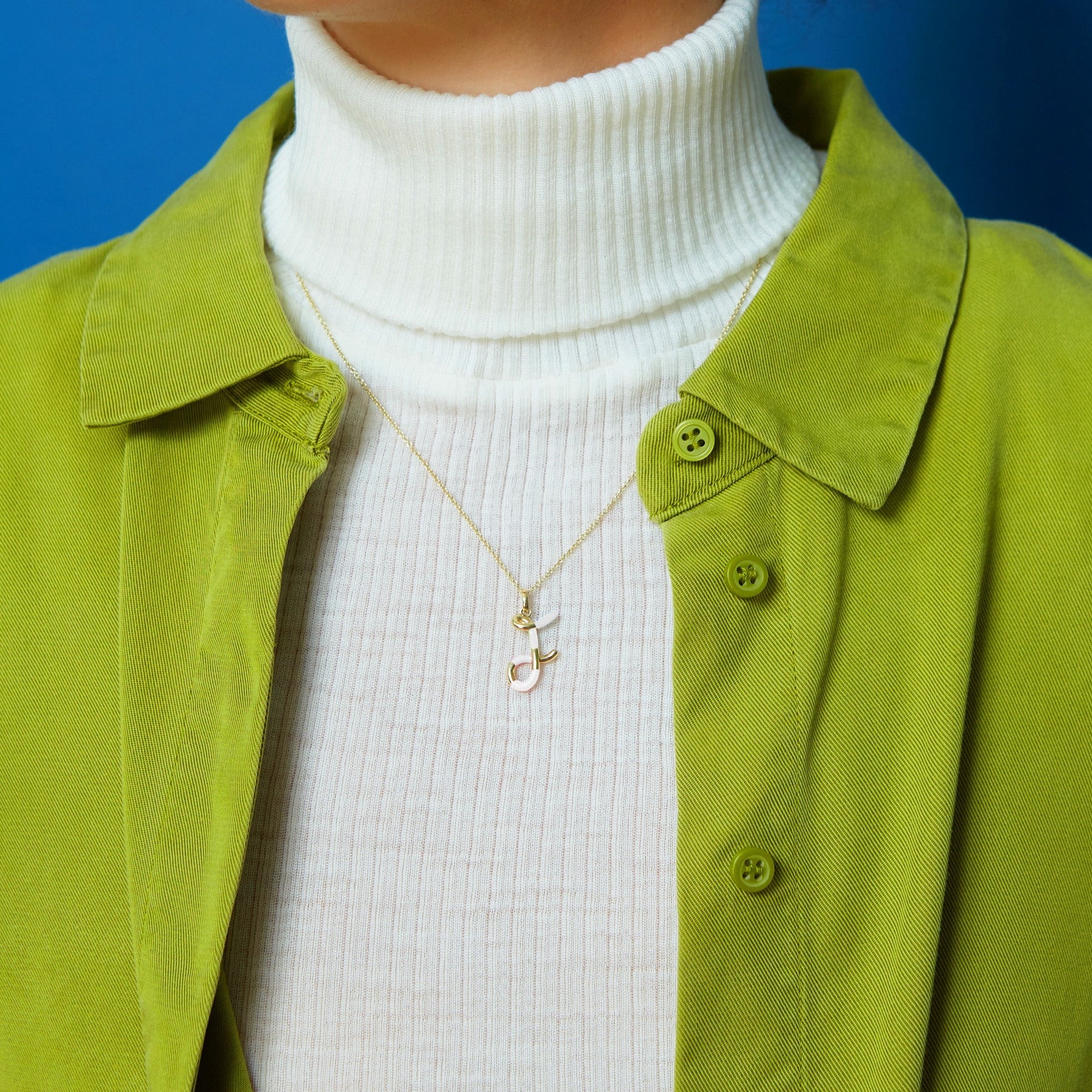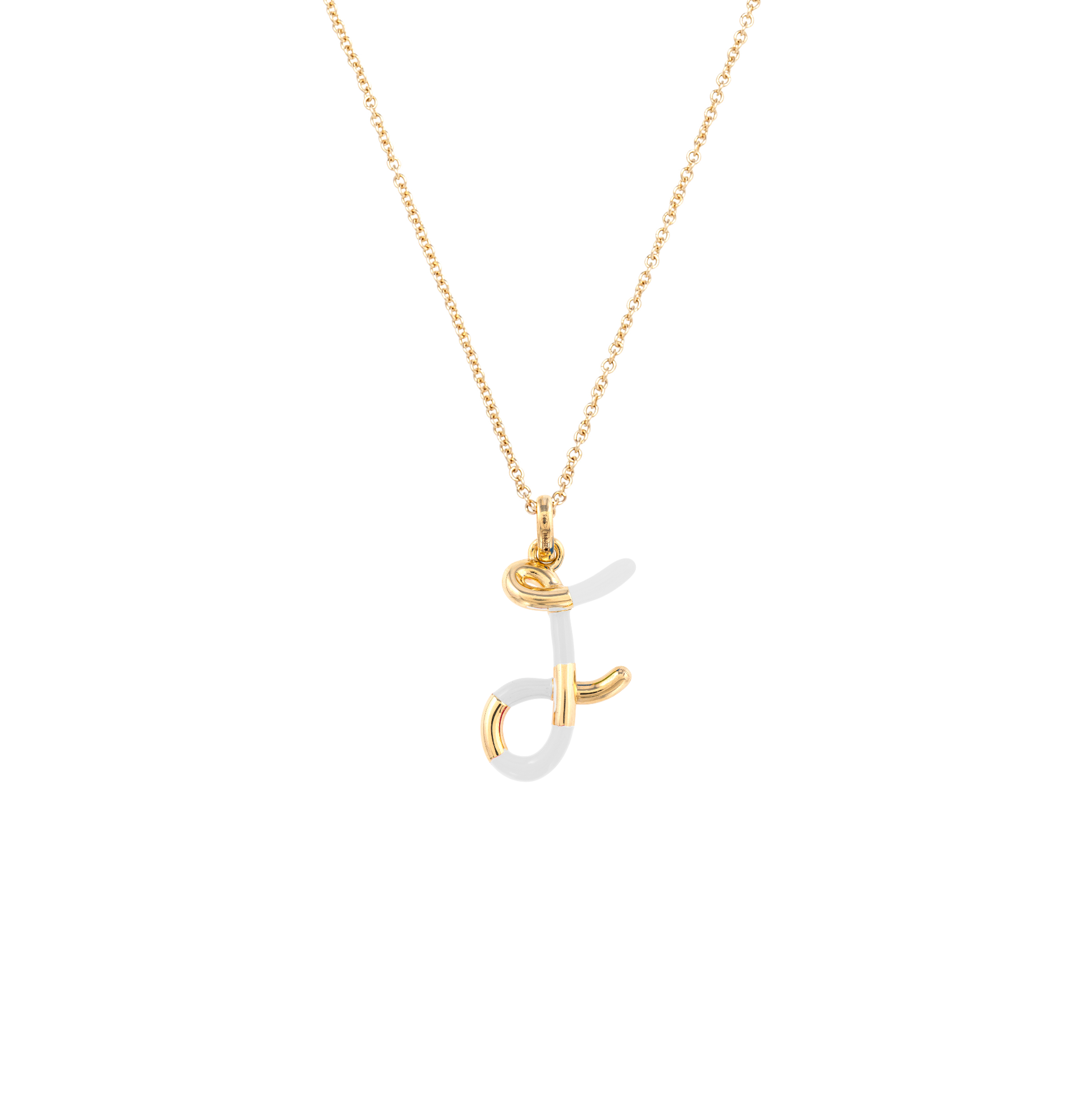 F Letter Necklace in 9kt yellow gold with white enamel.