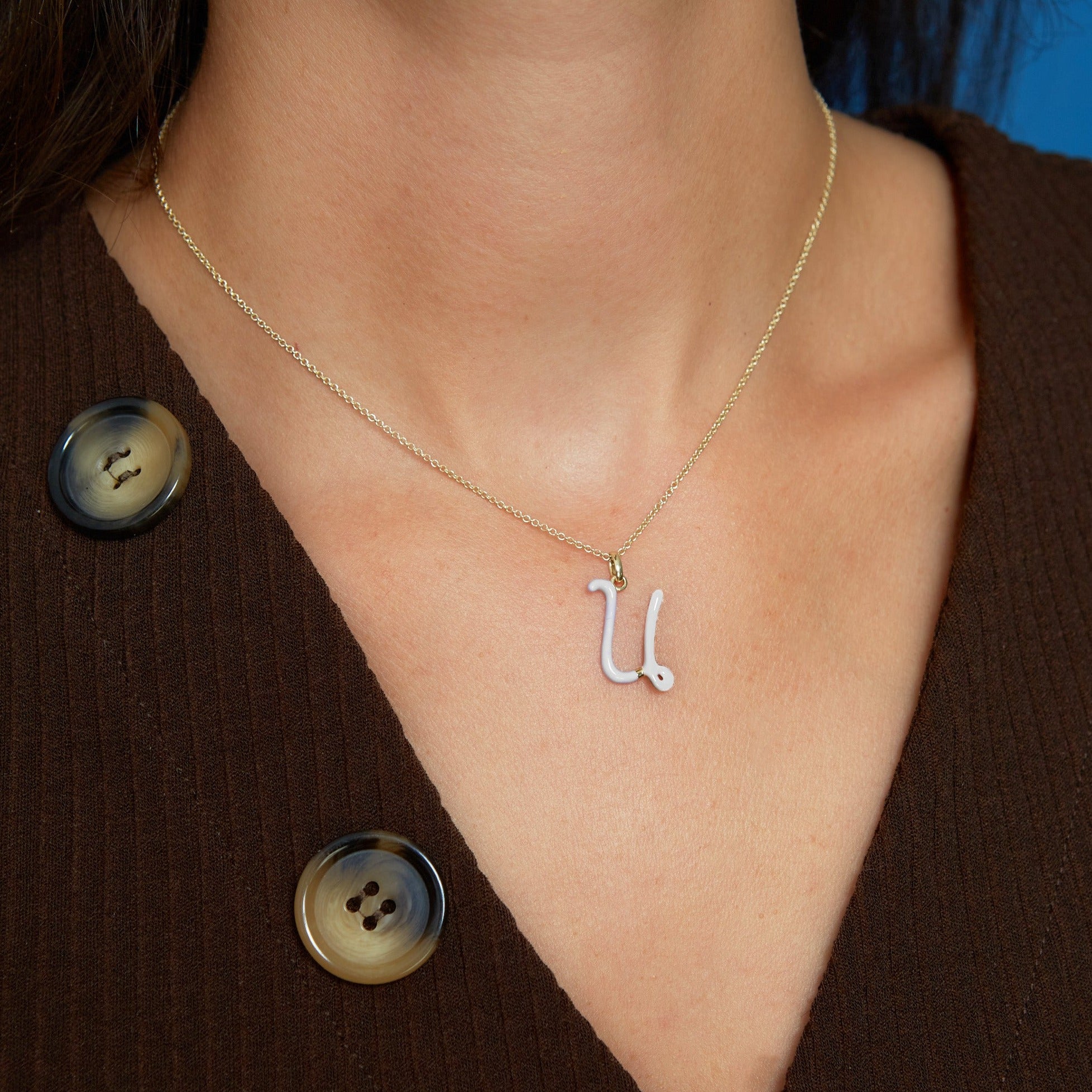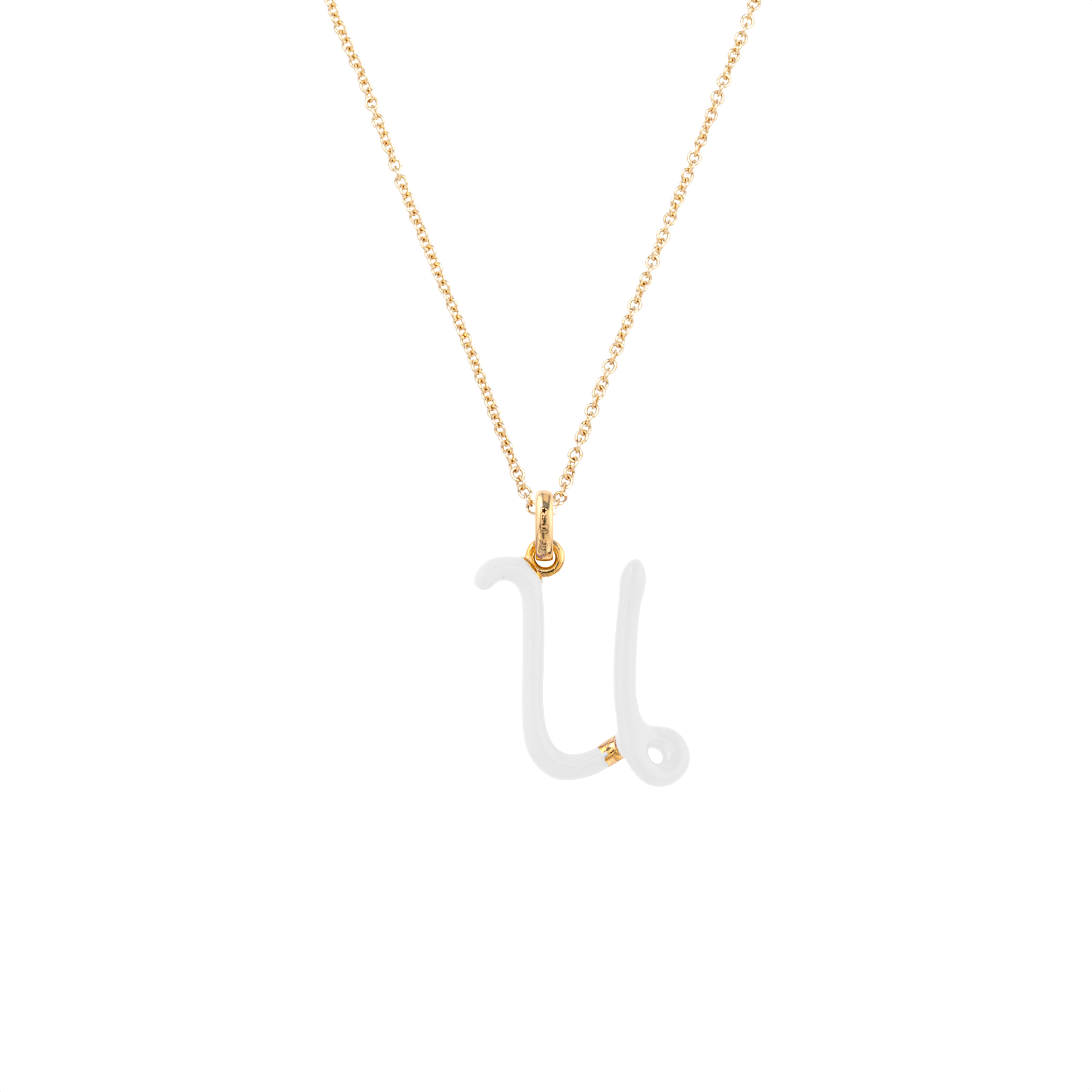 U Letter Necklace in 9kt yellow gold with white enamel.