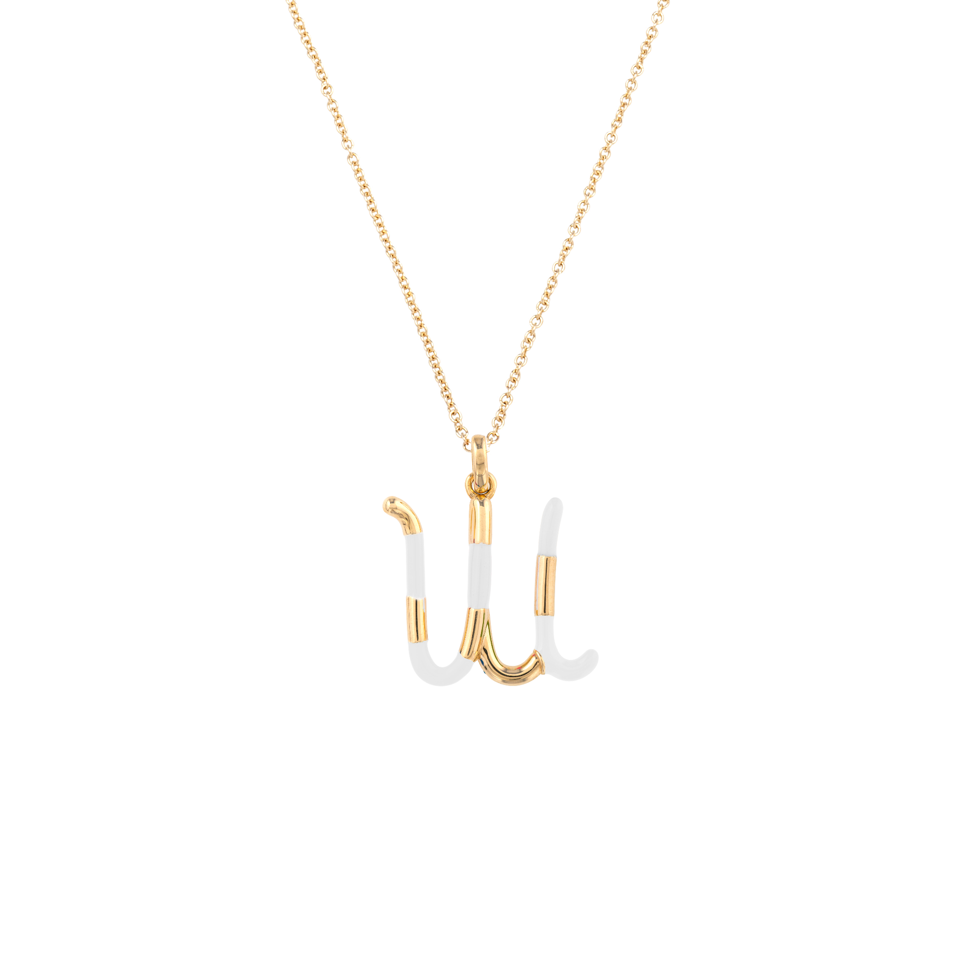 W Letter Necklace in 9kt yellow gold with white enamel.