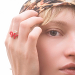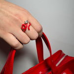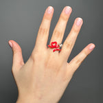 Baby Vine Heart Ring in gold and silver, featuring hand-painted red enamel and a marquise-cut rock crystal.