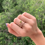 Baby vine tendril ring in yellow gold and silver, featuring hand-painted latte enamel and a marquise-cut peridot.