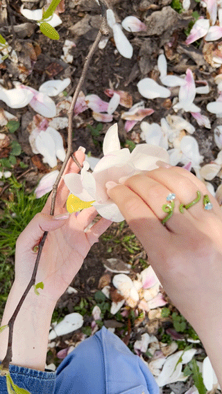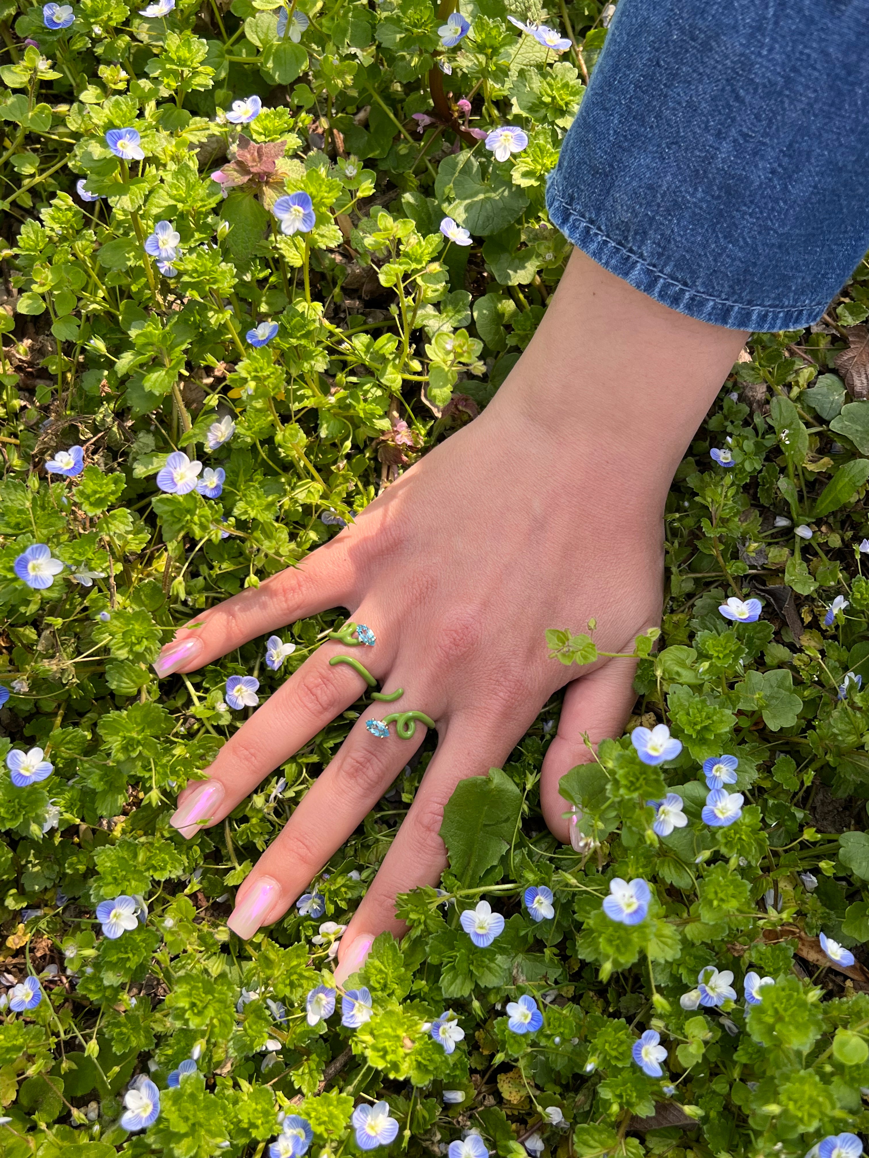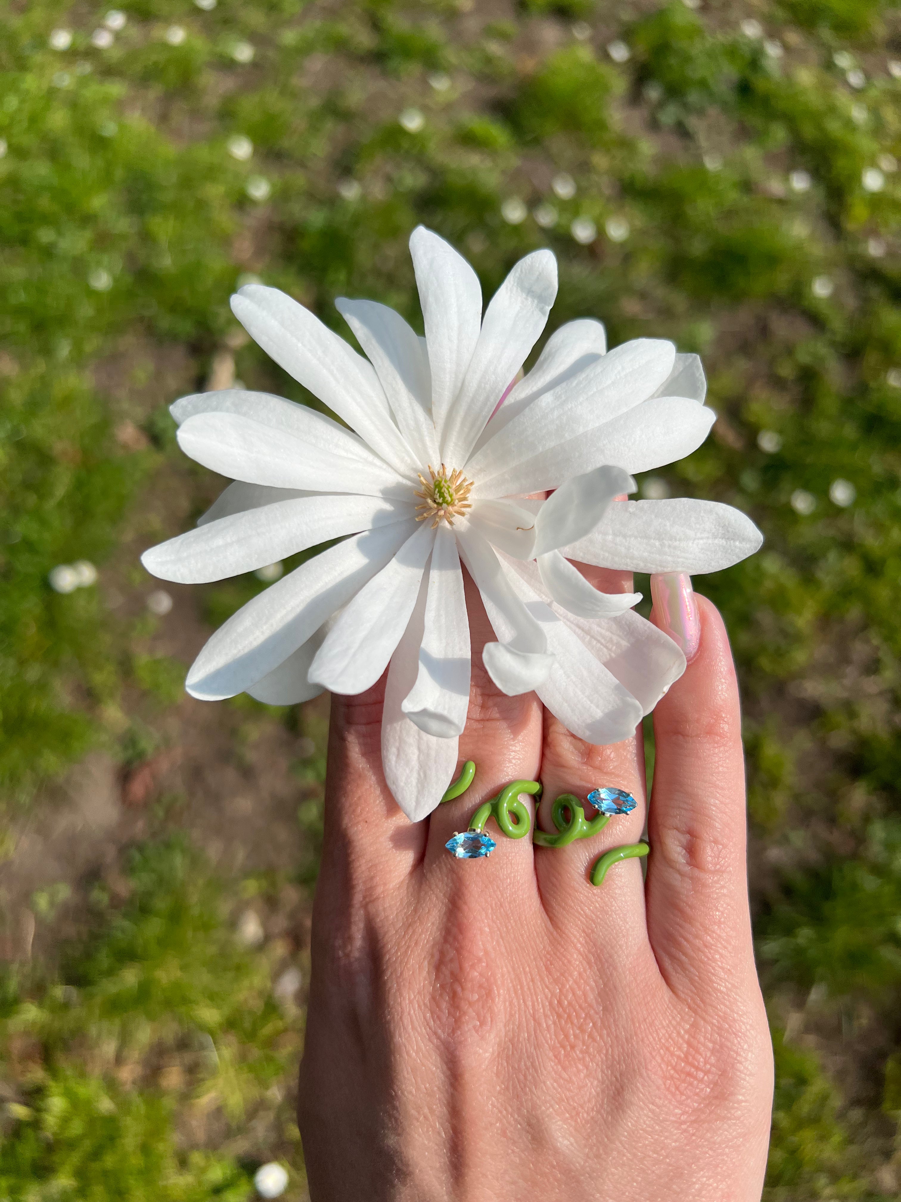 Baby vine tendril ring in yellow gold and silver, featuring hand-painted pistacchio enamel and a marquise-cut topaz.