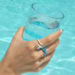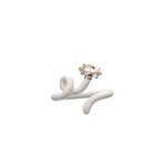 Baby vine tendril ring in yellow gold and silver, featuring hand-painted white enamel and a marquise-cut rock crystal.