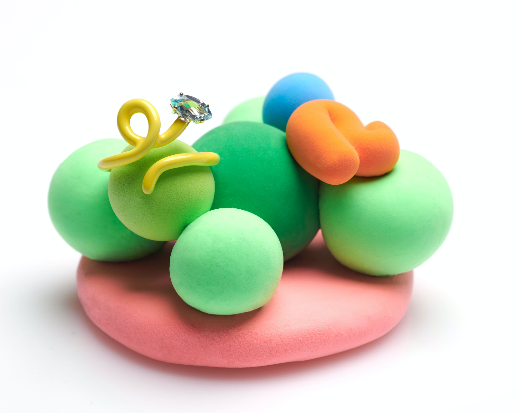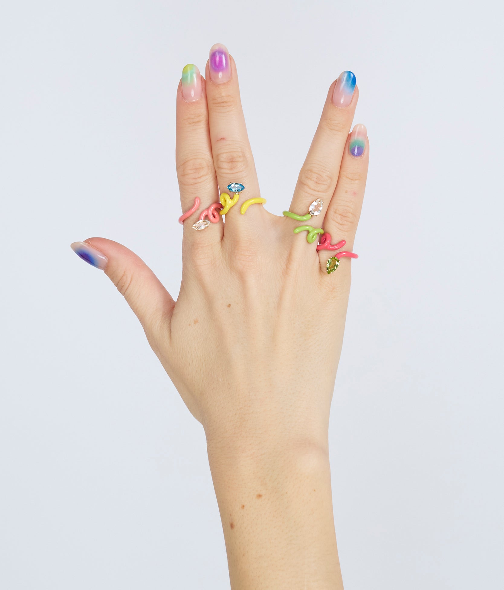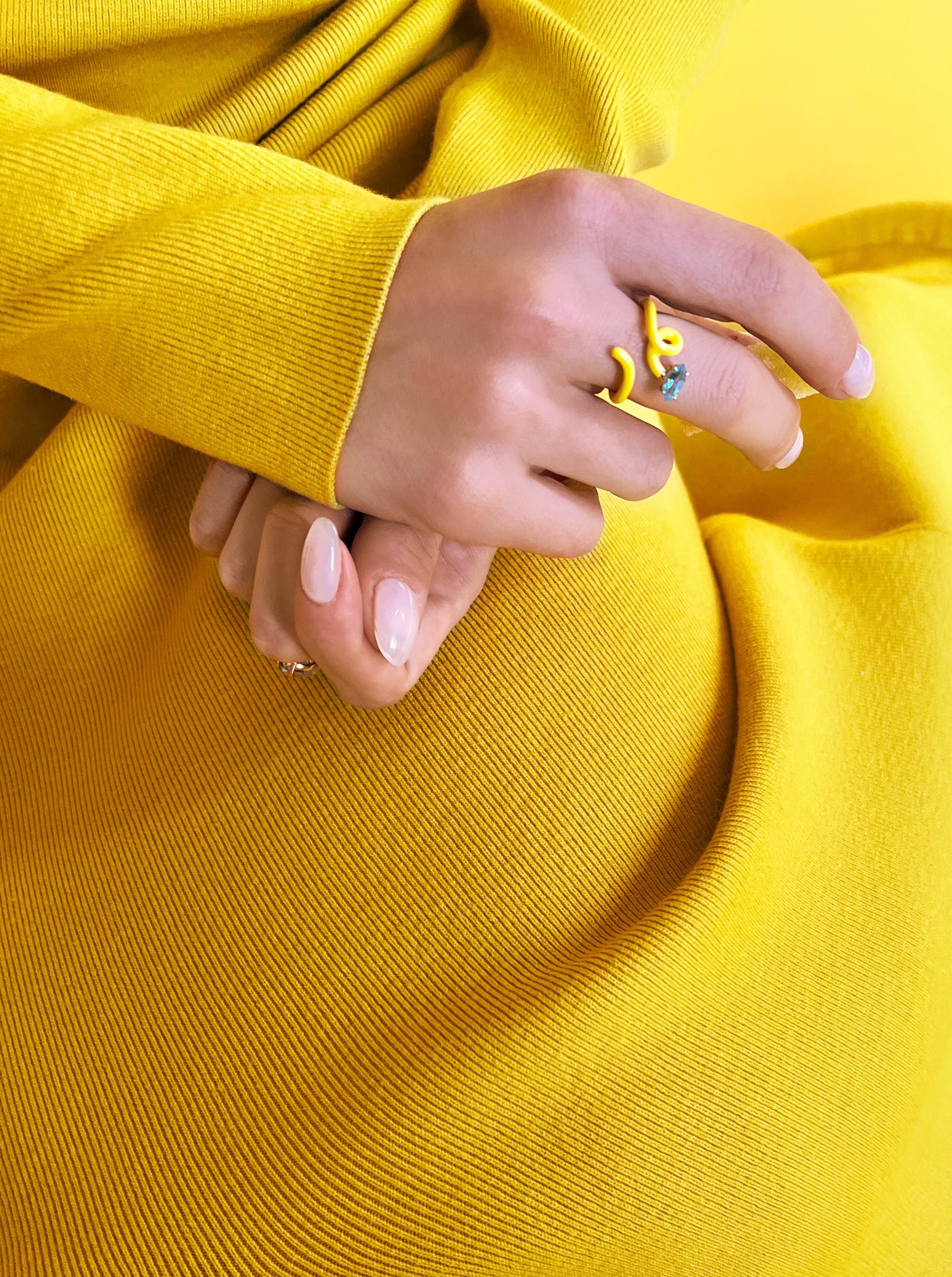 Baby vine tendril ring in yellow gold and silver, featuring hand-painted yellow enamel and a marquise-cut topaz.