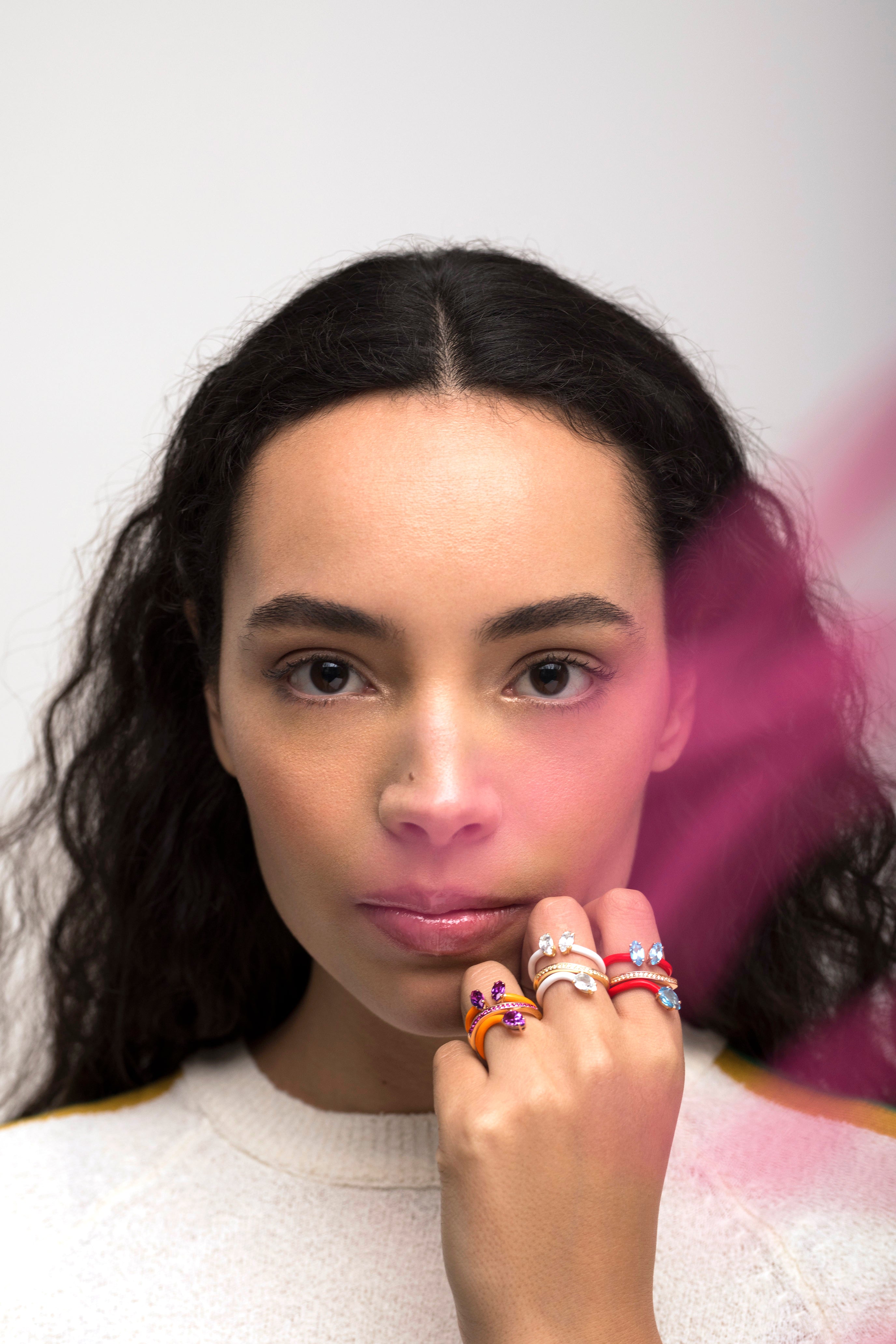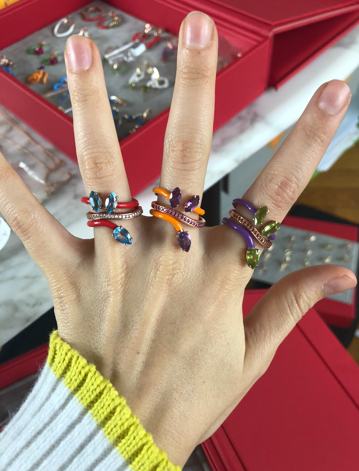 Composable vine tendril ring in rose gold, featuring hand-painted orange enamel, fuchsia sapphire pavé and marquise and drop-cut amethysts.