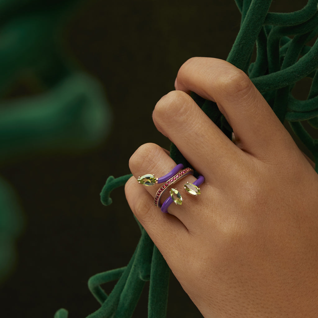 Composable vine tendril ring in rose gold, featuring hand-painted purple enamel, orange sapphire pavé and marquise and drop-cut peridots