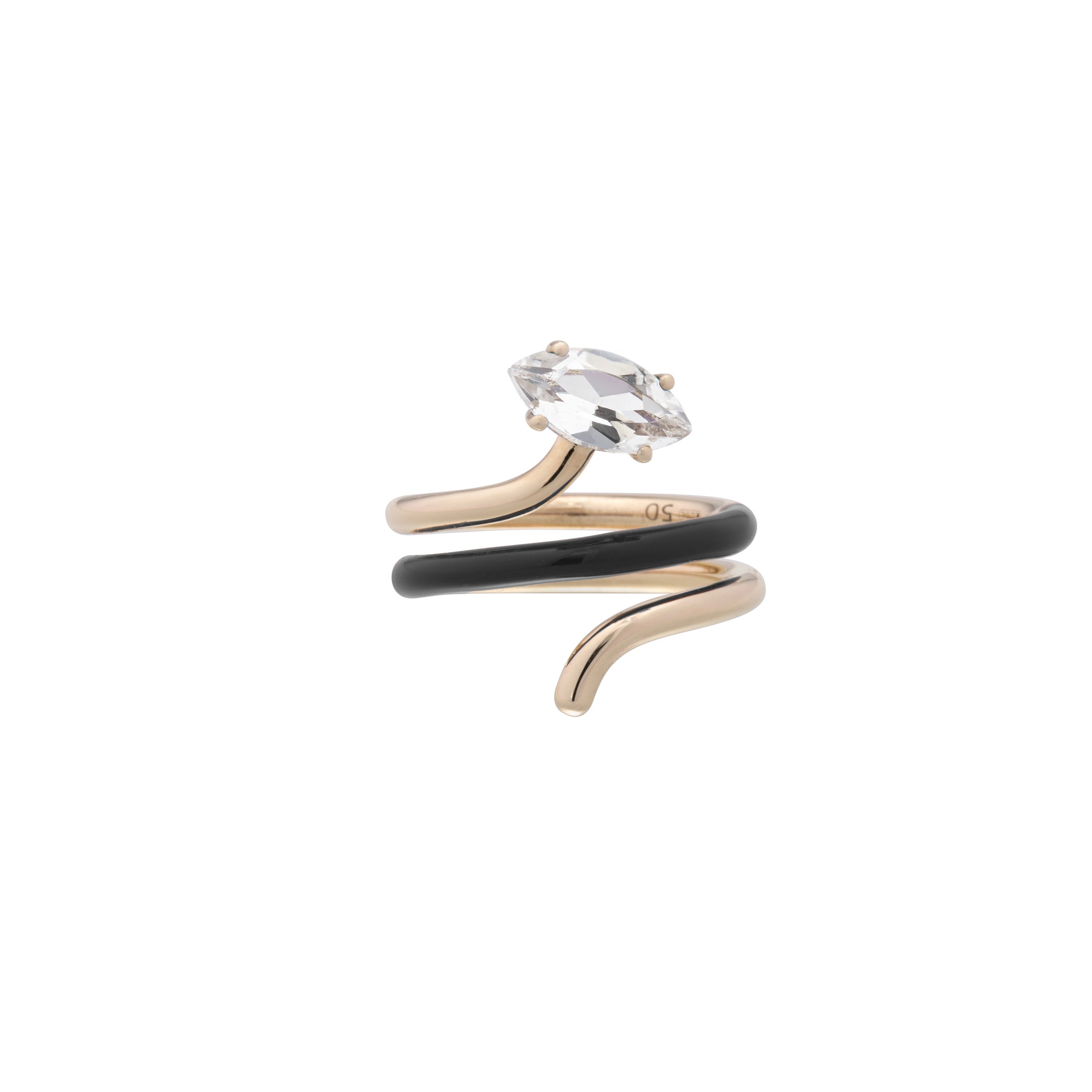 Long vine ring in yellow gold, featuring hand-painted black enamel in the center and a marquise-cut rock crystal.