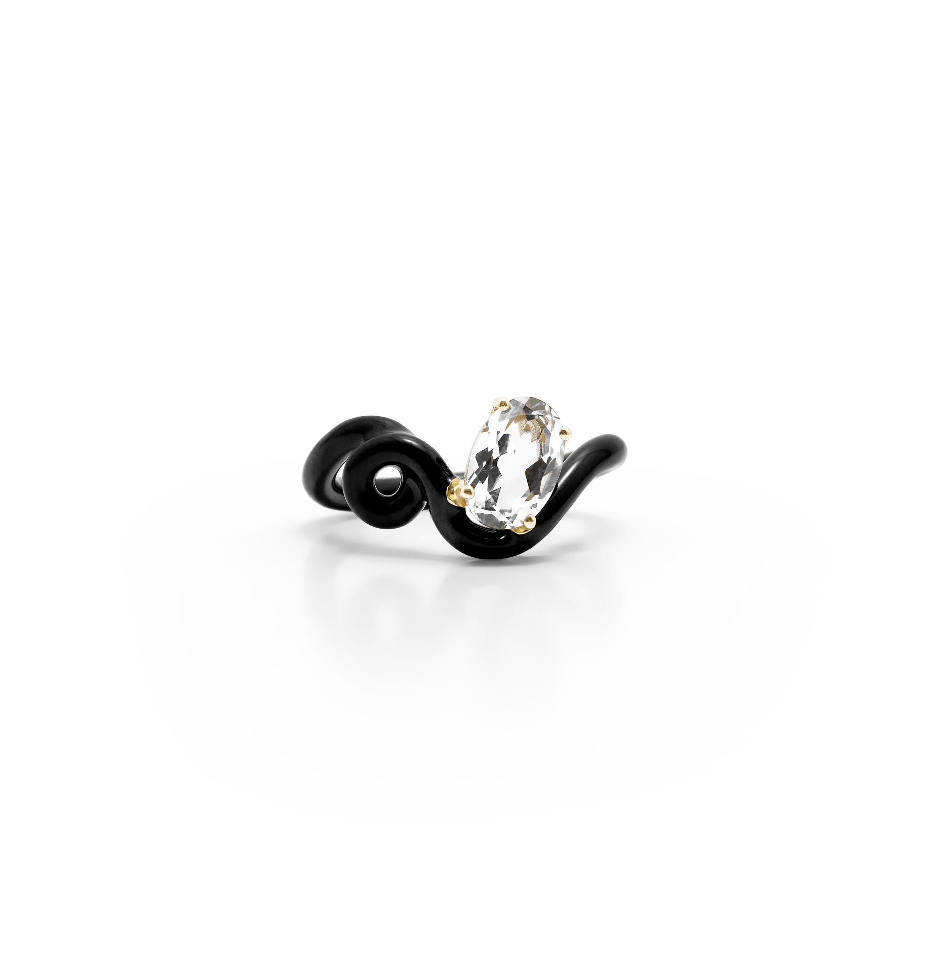 Oval vine ring in yellow gold and silver, featuring hand-painted black enamel and a oval-cut rock crystal.