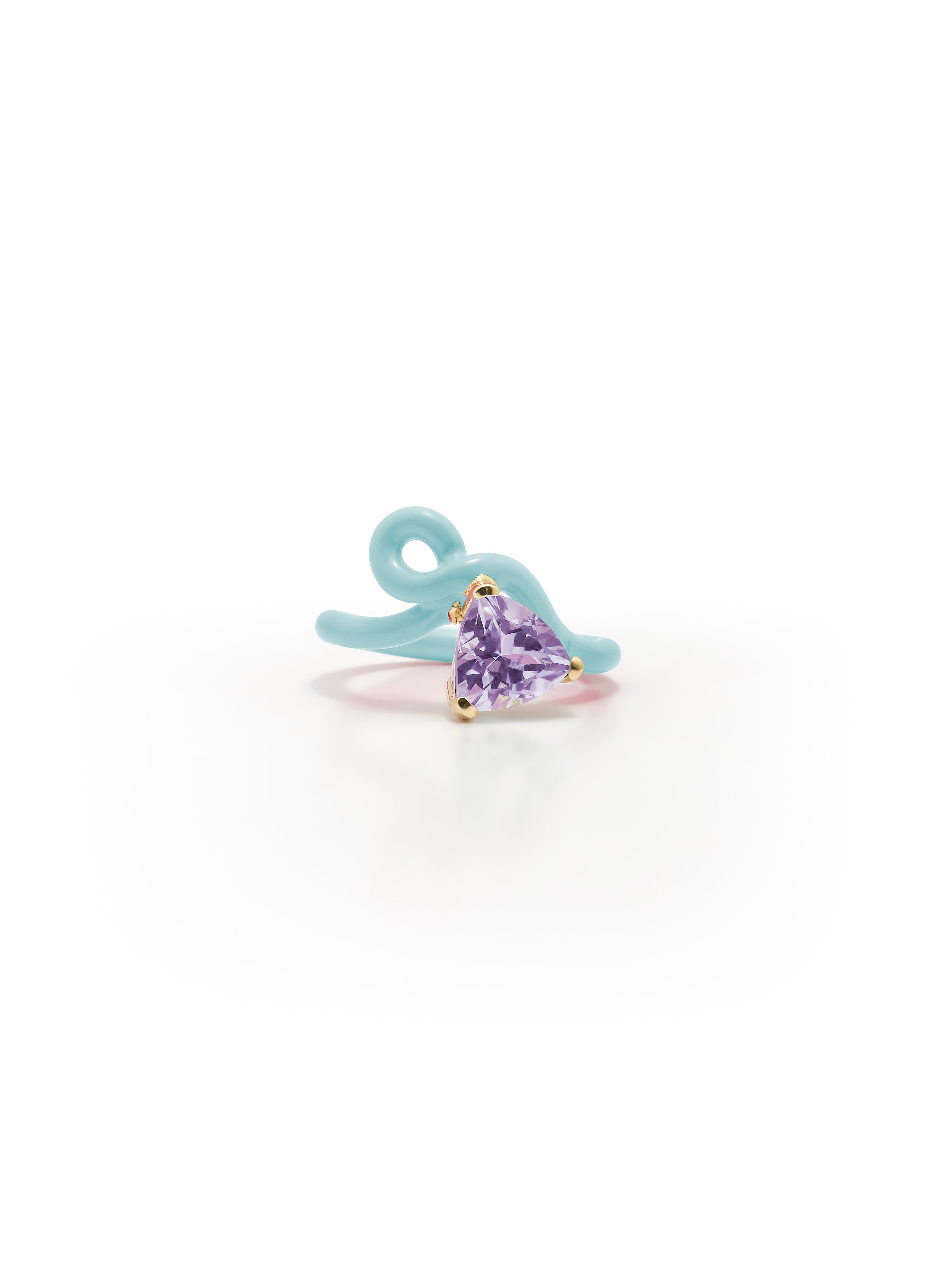 Trillion vine ring in yellow gold and silver, featuring hand-painted blue iris enamel and a trillion-cut amethyst.