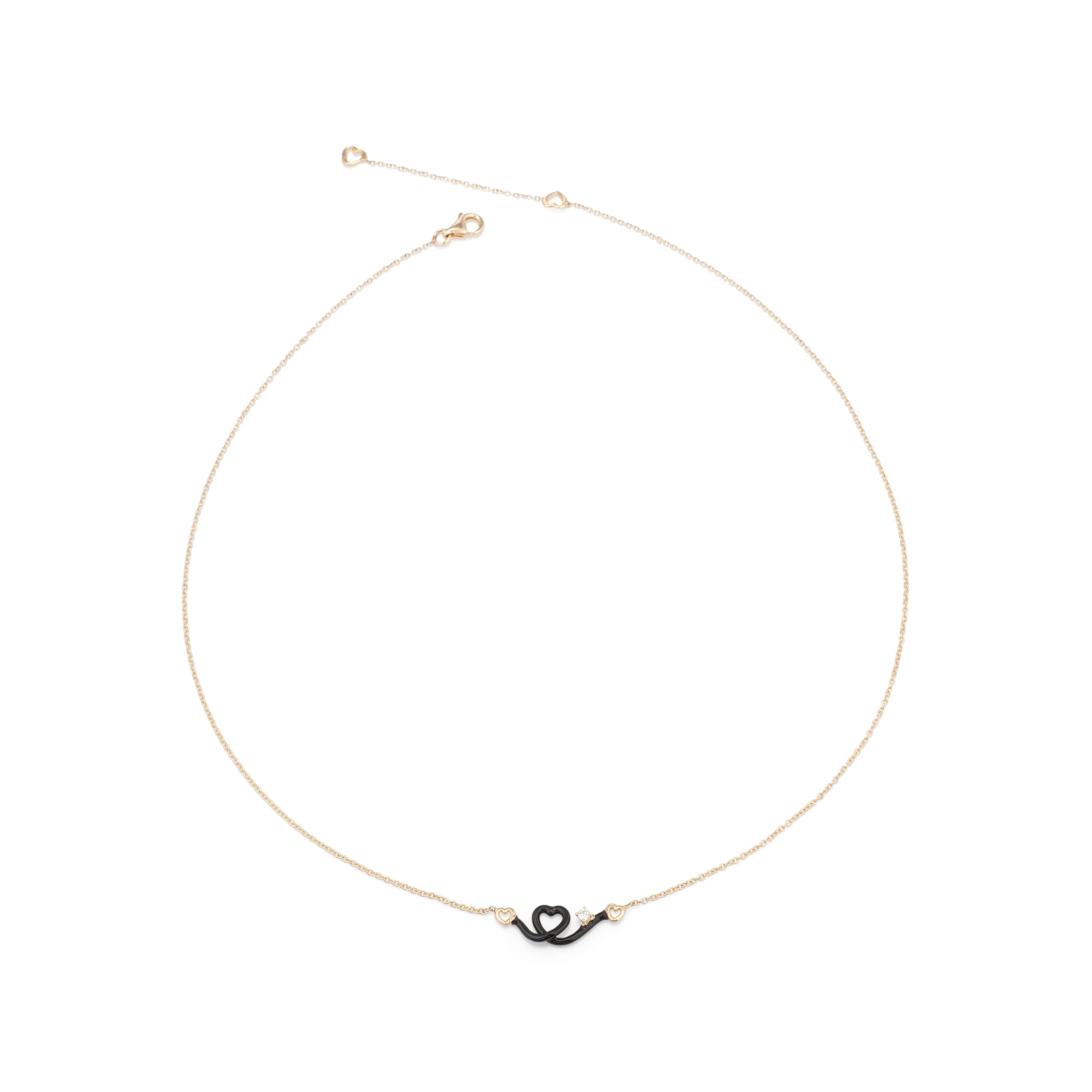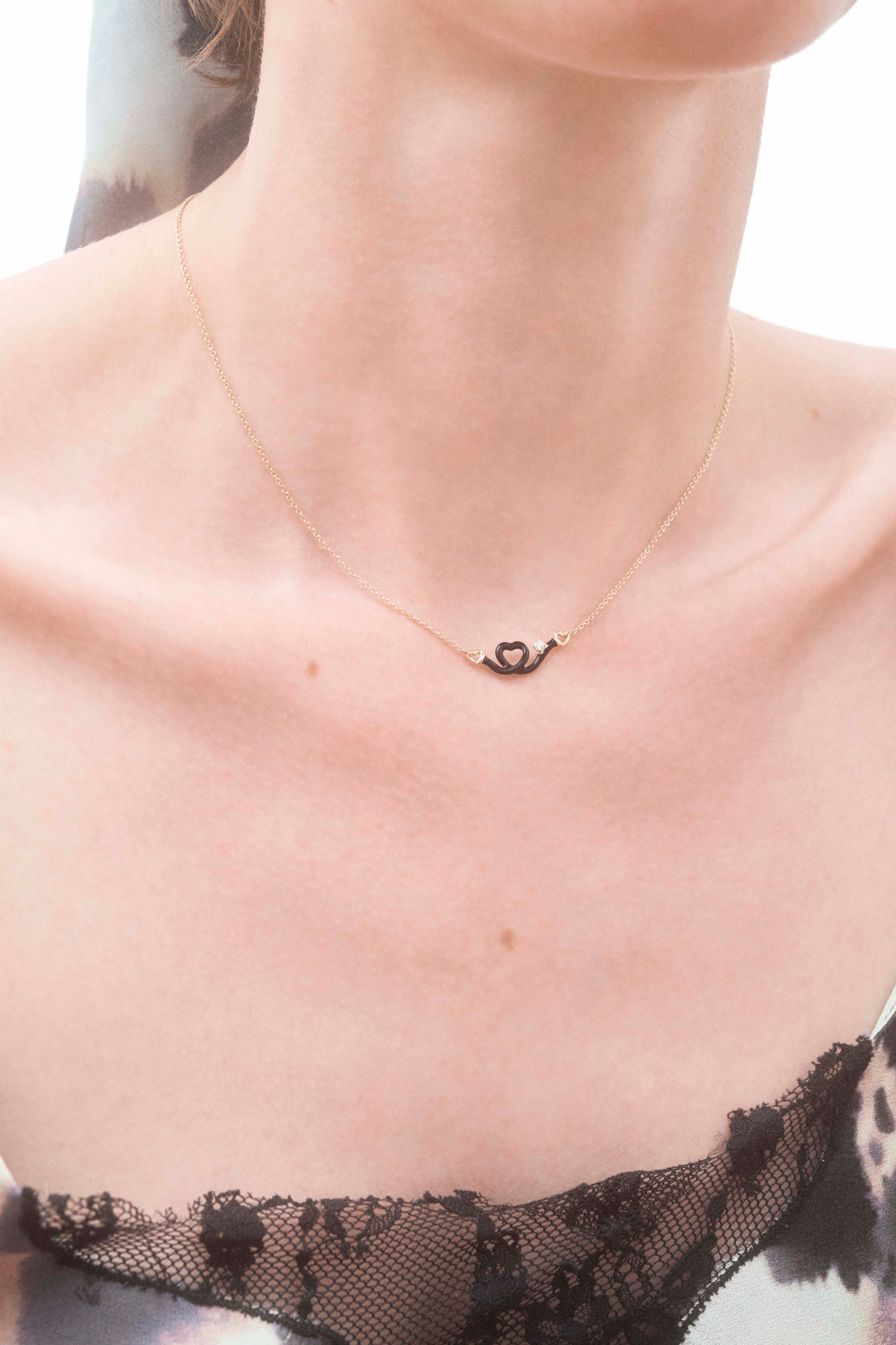 Gold necklace with a heart-shaped pendant, hand-painted with black enamel and accented by a round-cut diamond.