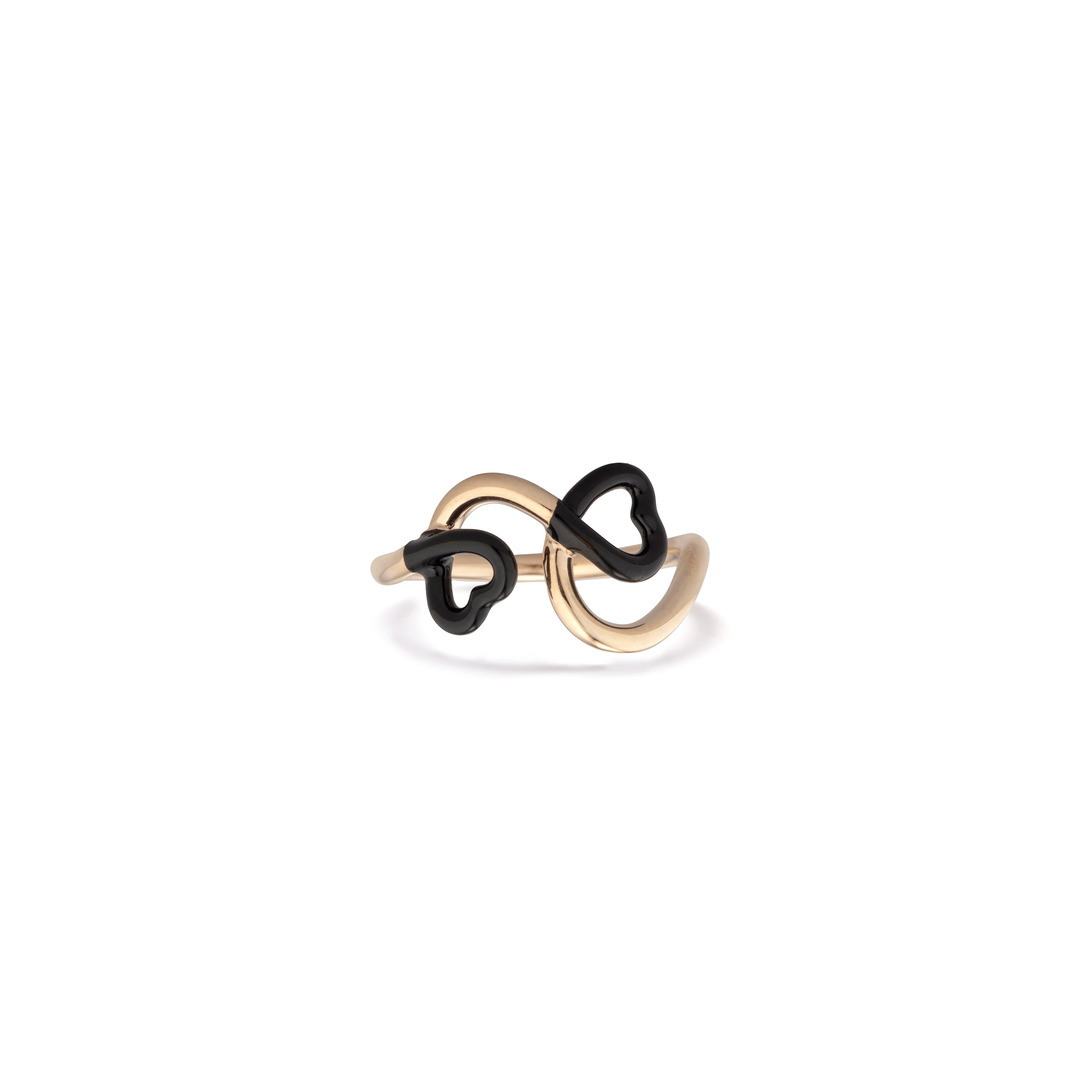 Gold ring featuring a double heart-shaped design, hand-painted with black enamel.