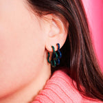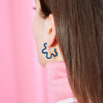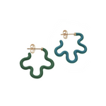2 TONE ASYMMETRICAL FLOWER POWER EARRINGS IN TEAL AND EMARALD GREEN