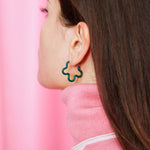 These 2-tone earrings feature a flower design in emerald green and teal.