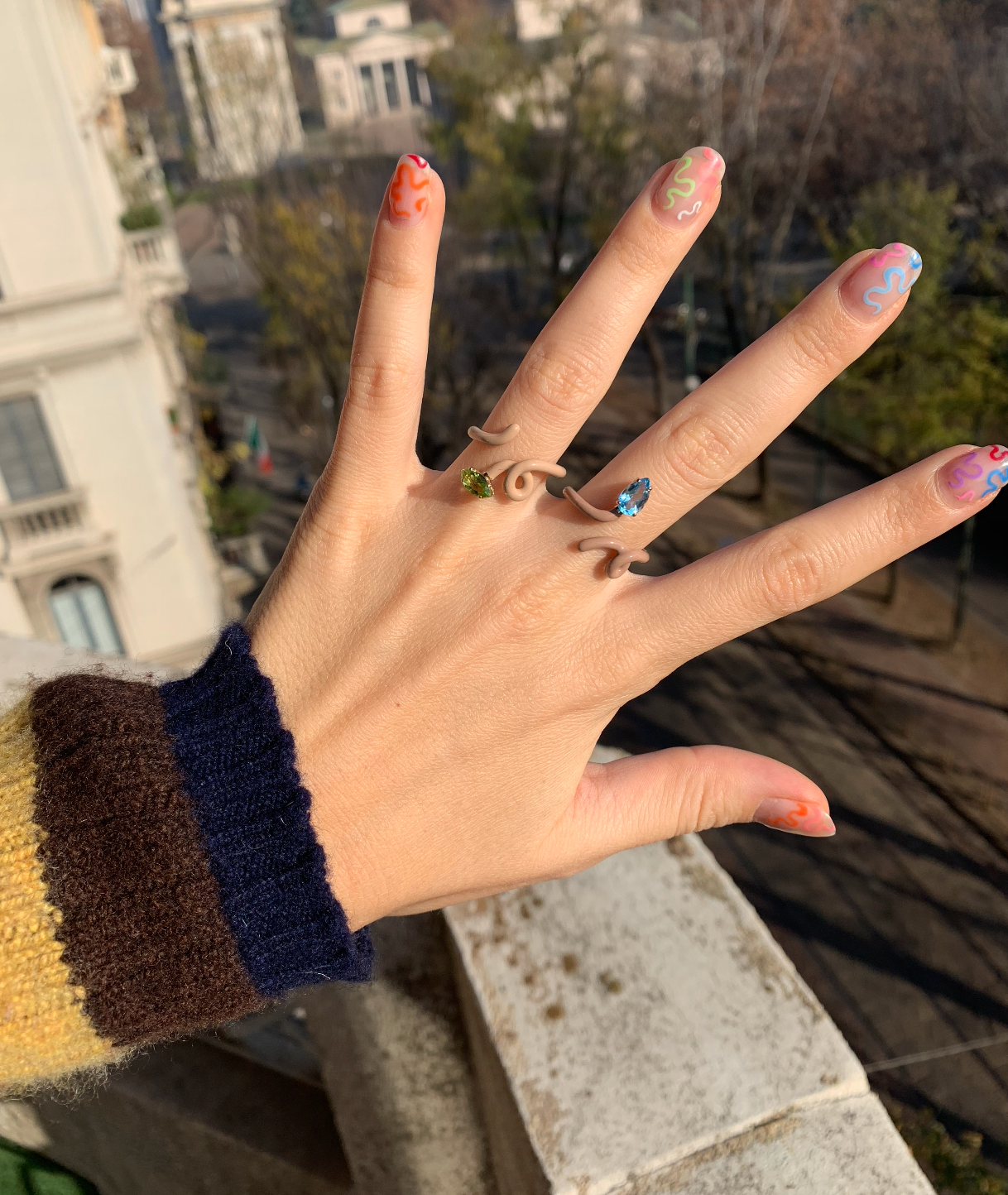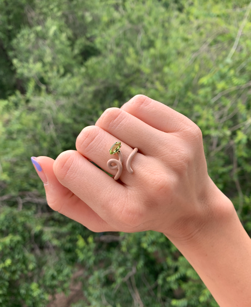 Baby vine tendril ring in yellow gold and silver, featuring hand-painted latte enamel and a marquise-cut peridot.