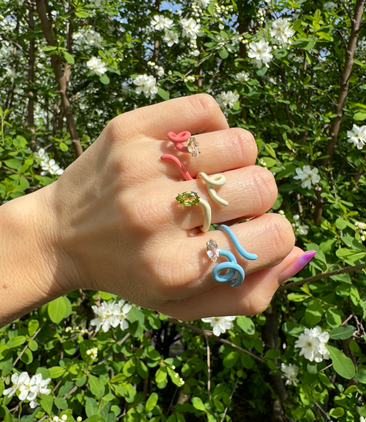 Baby vine tendril ring in gold and silver, featuring hand-painted light pink enamel and a marquise-cut rock crystal.