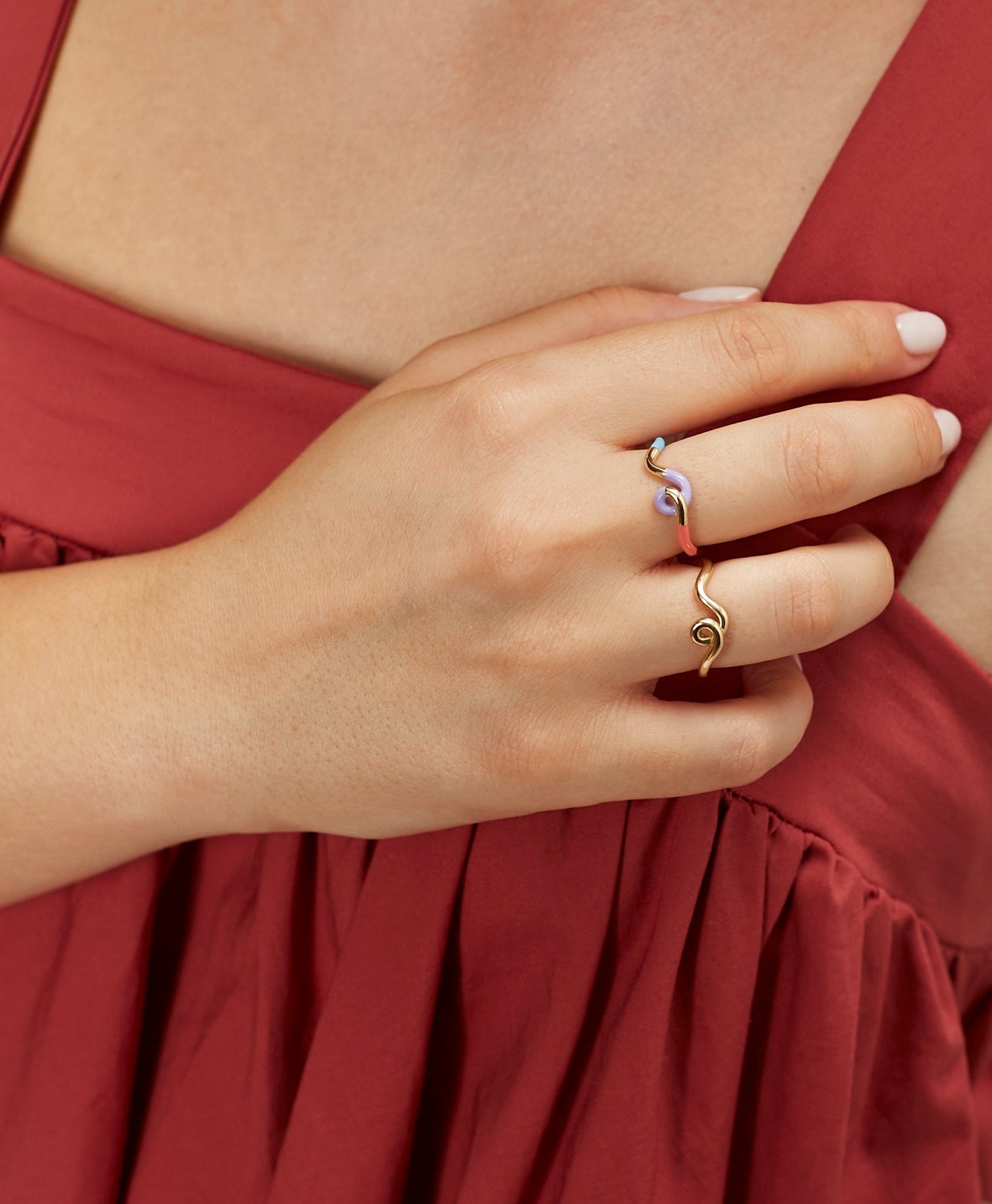 Multi frequency ring in yellow gold with baby blue, lavender and light pink enamel.