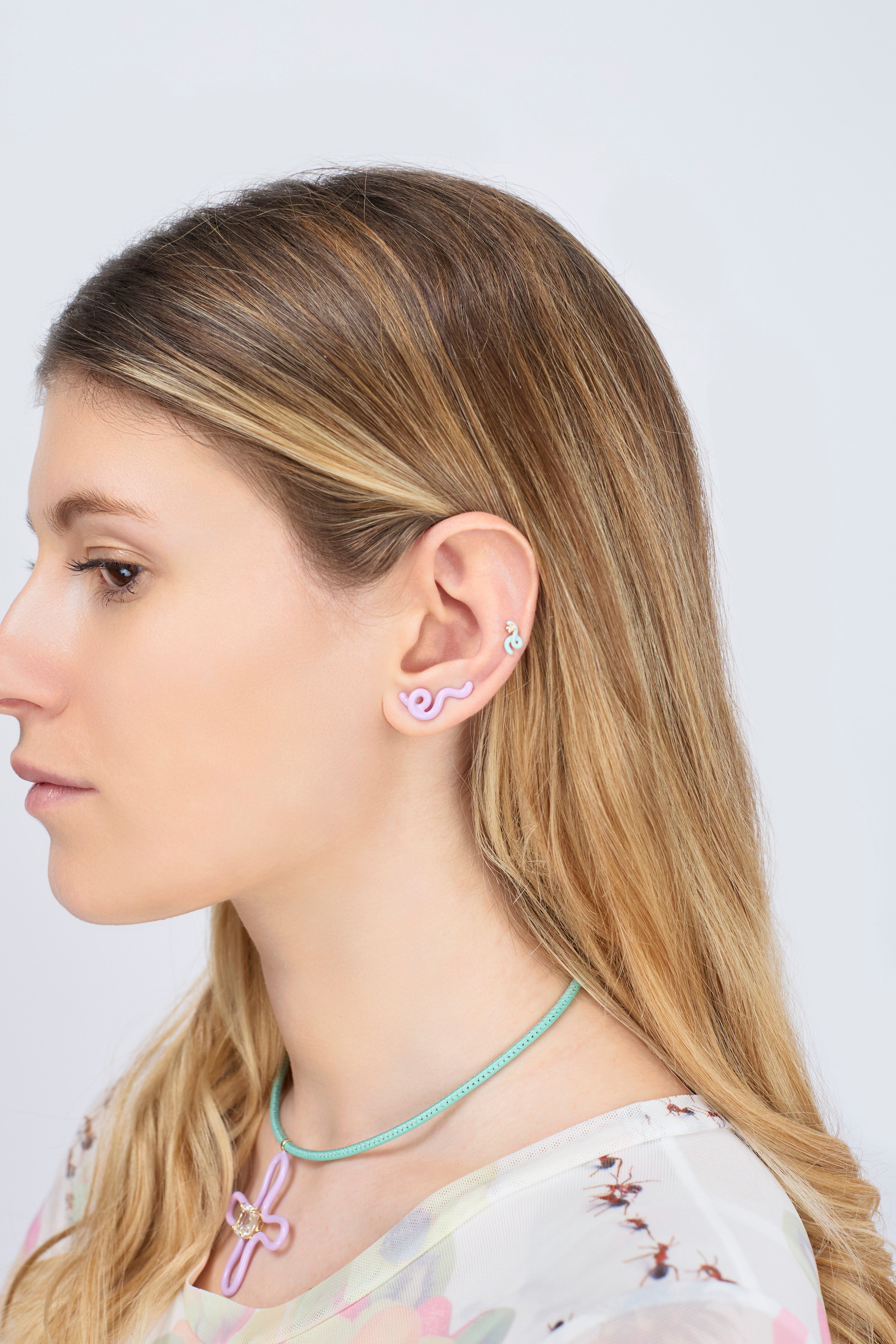 Pop Choker in yellow gold and silver with a Lucky Flower pendant featuring an octagon-cut rock crystal and lavender enamel, paired with a blue mint leather cord.