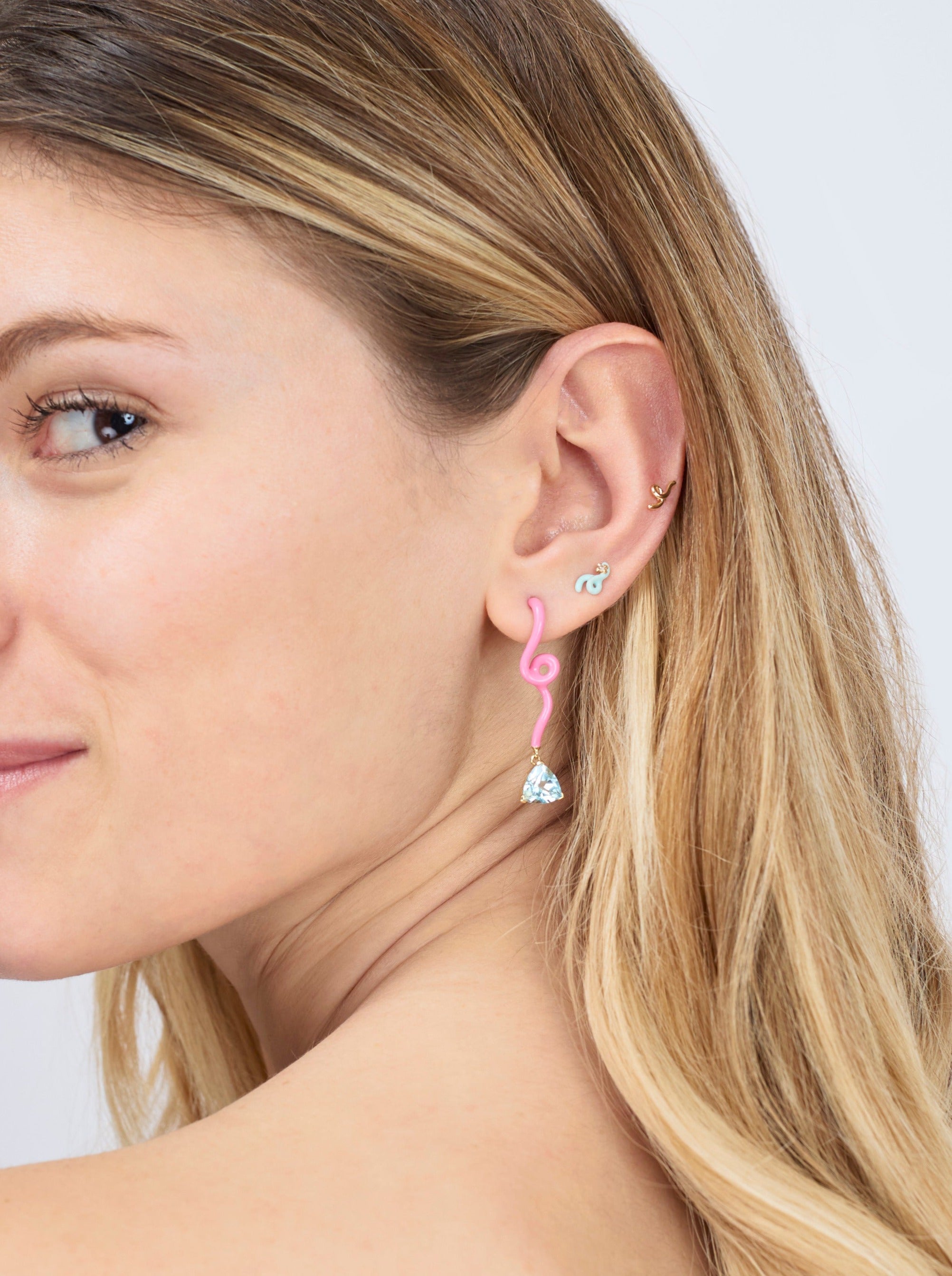 Trillion vine pendant earrings in yellow gold, featuring bubblegum pink enamel and trillion-cut topaz.
