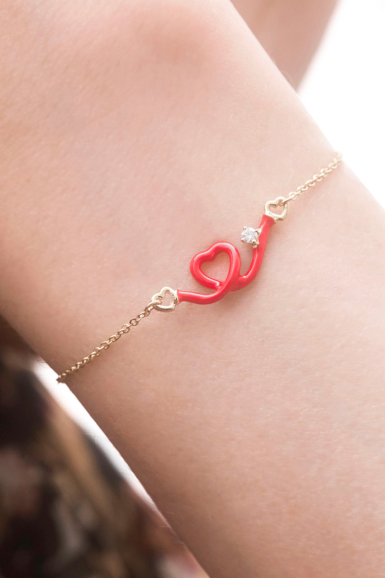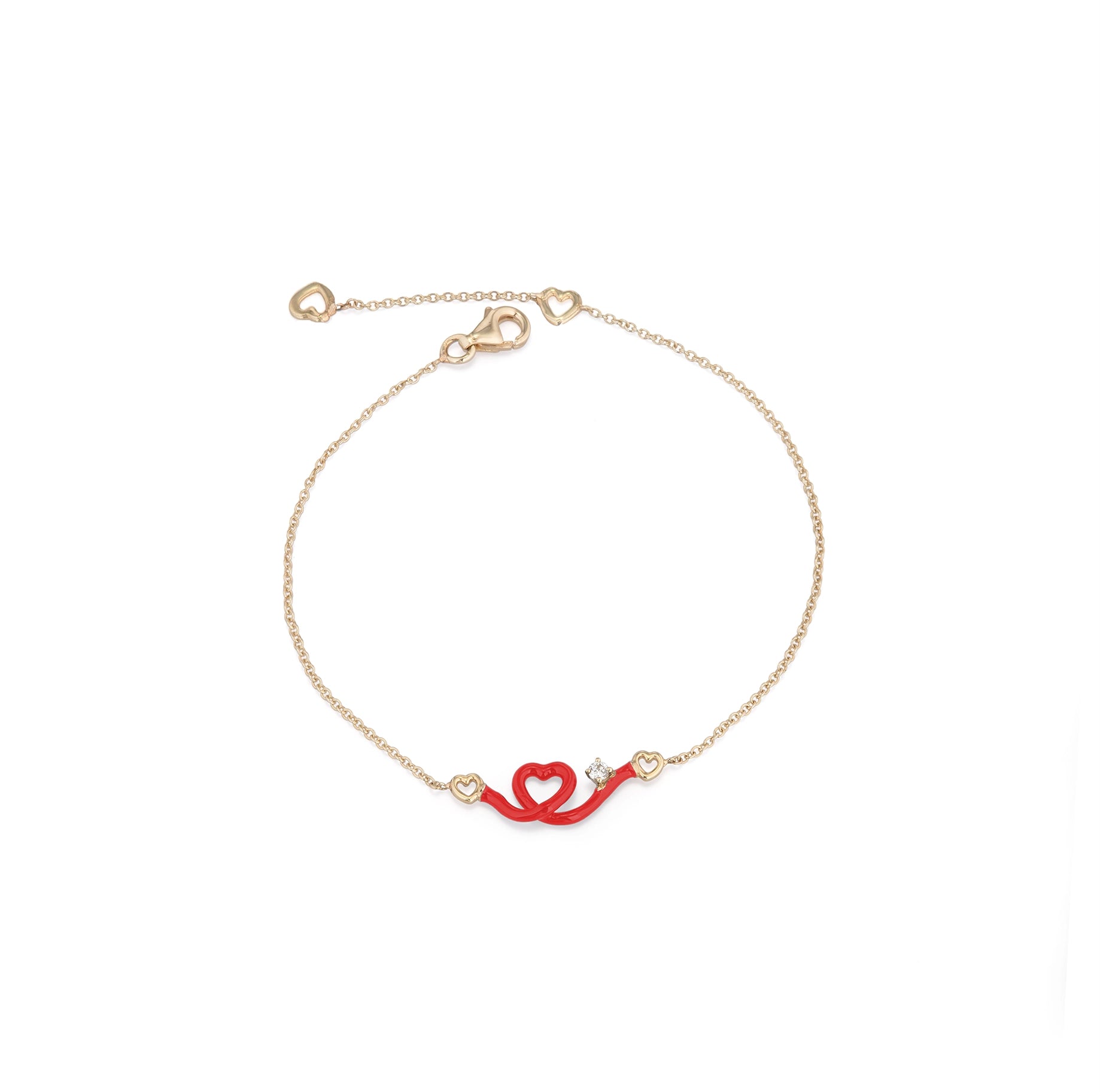 Gold bracelet with a heart-shaped pendant, hand-painted with red enamel and accented by a round-cut diamond.