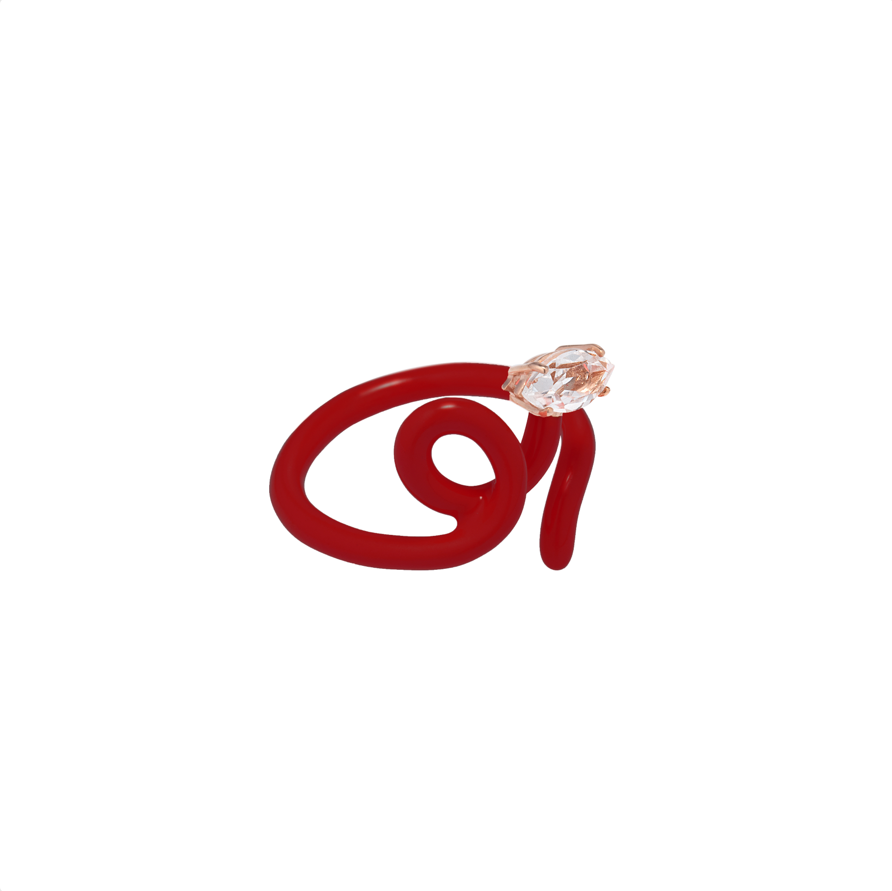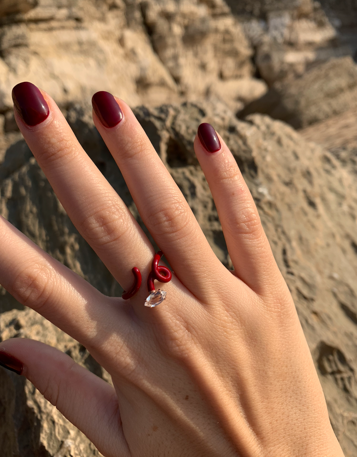 Baby vine tendril ring in gold and silver, featuring hand-painted burgundy enamel and a marquise-cut rock crystal.