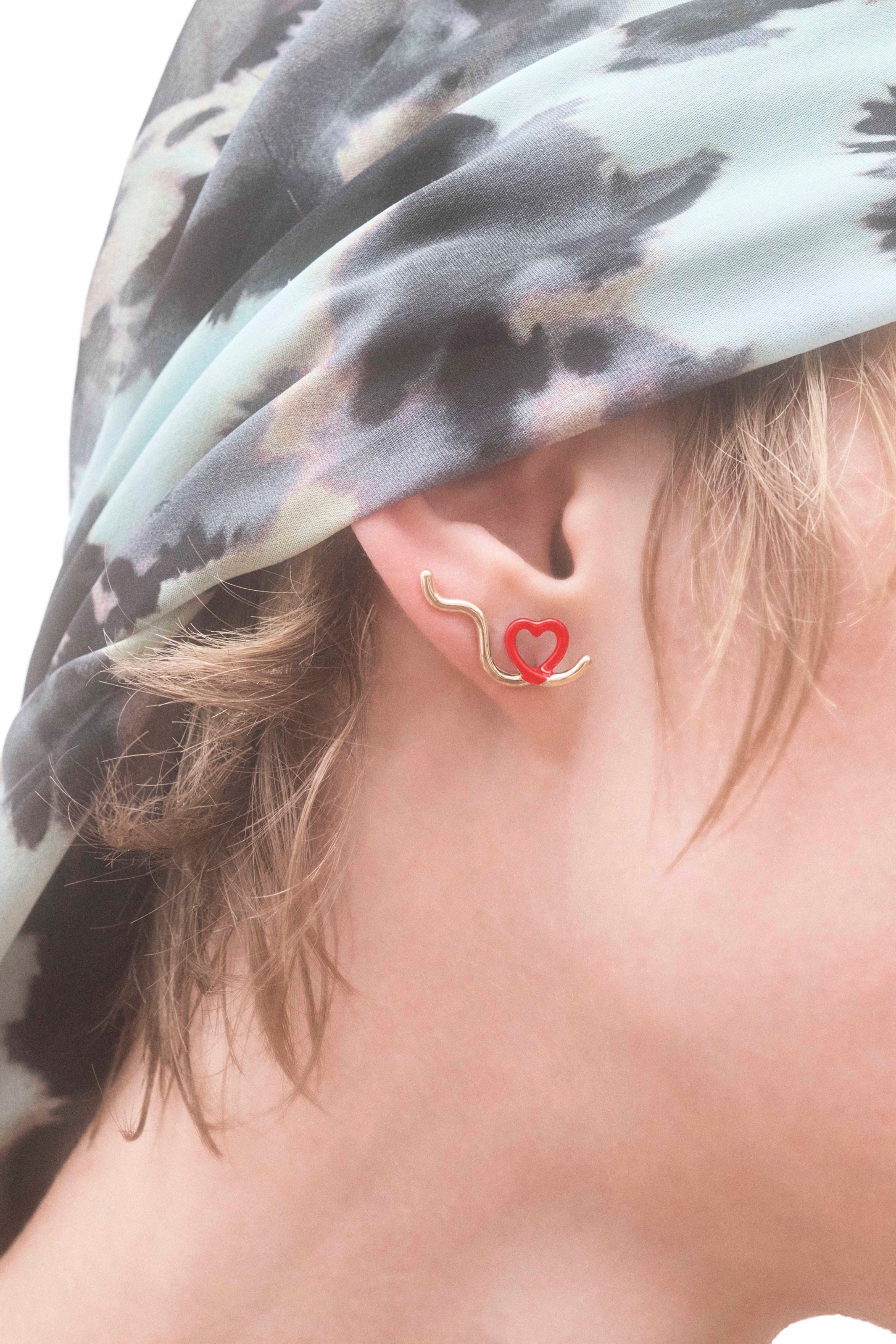 Gold crawler earrings featuring a red hand-painted enamel heart detail.