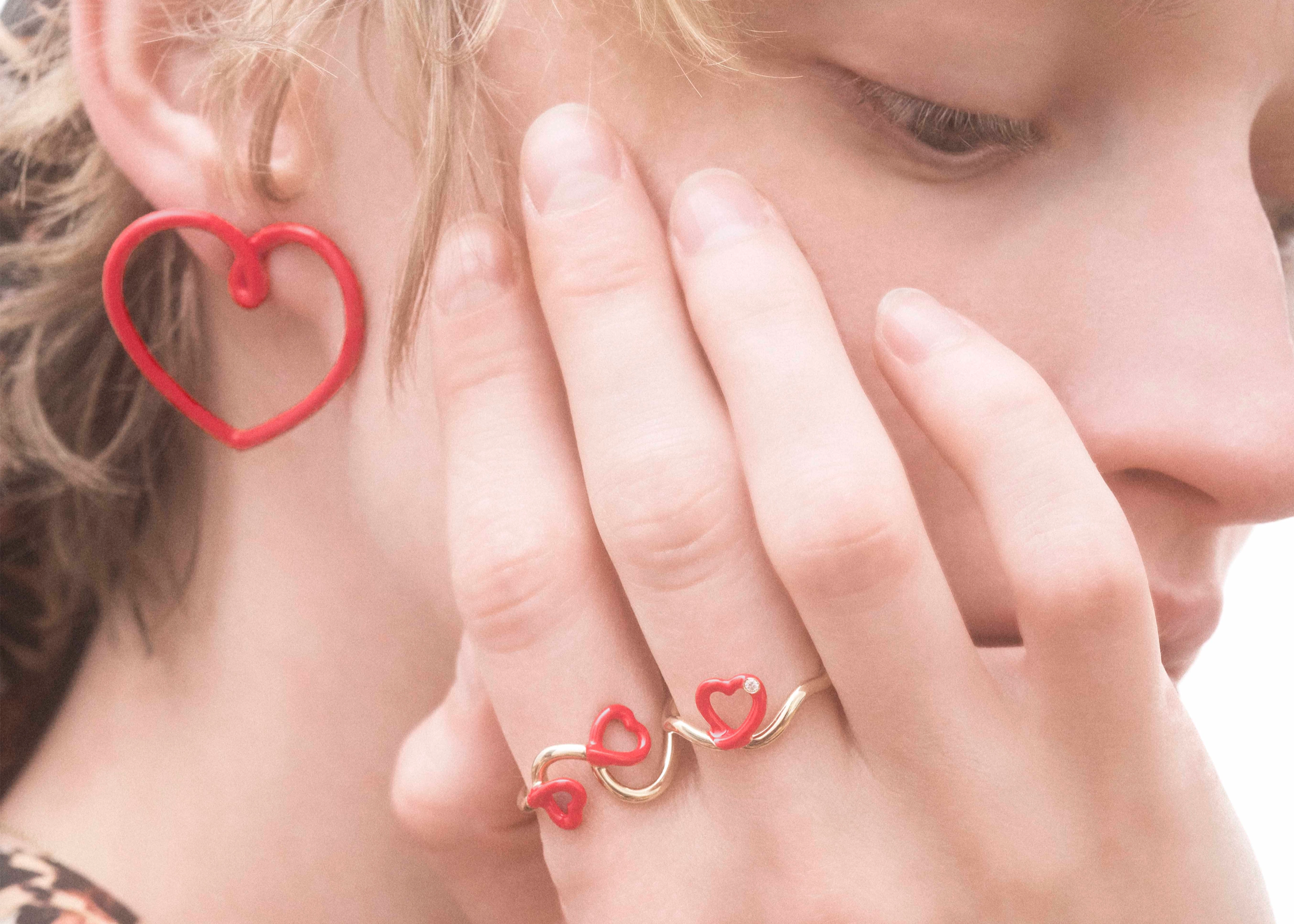 Gold ring featuring a double heart-shaped design, hand-painted with red enamel.