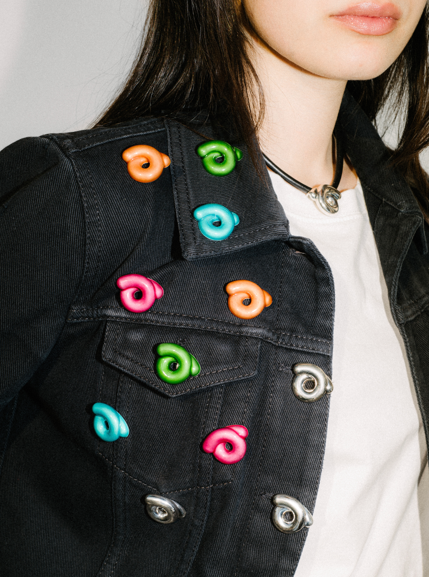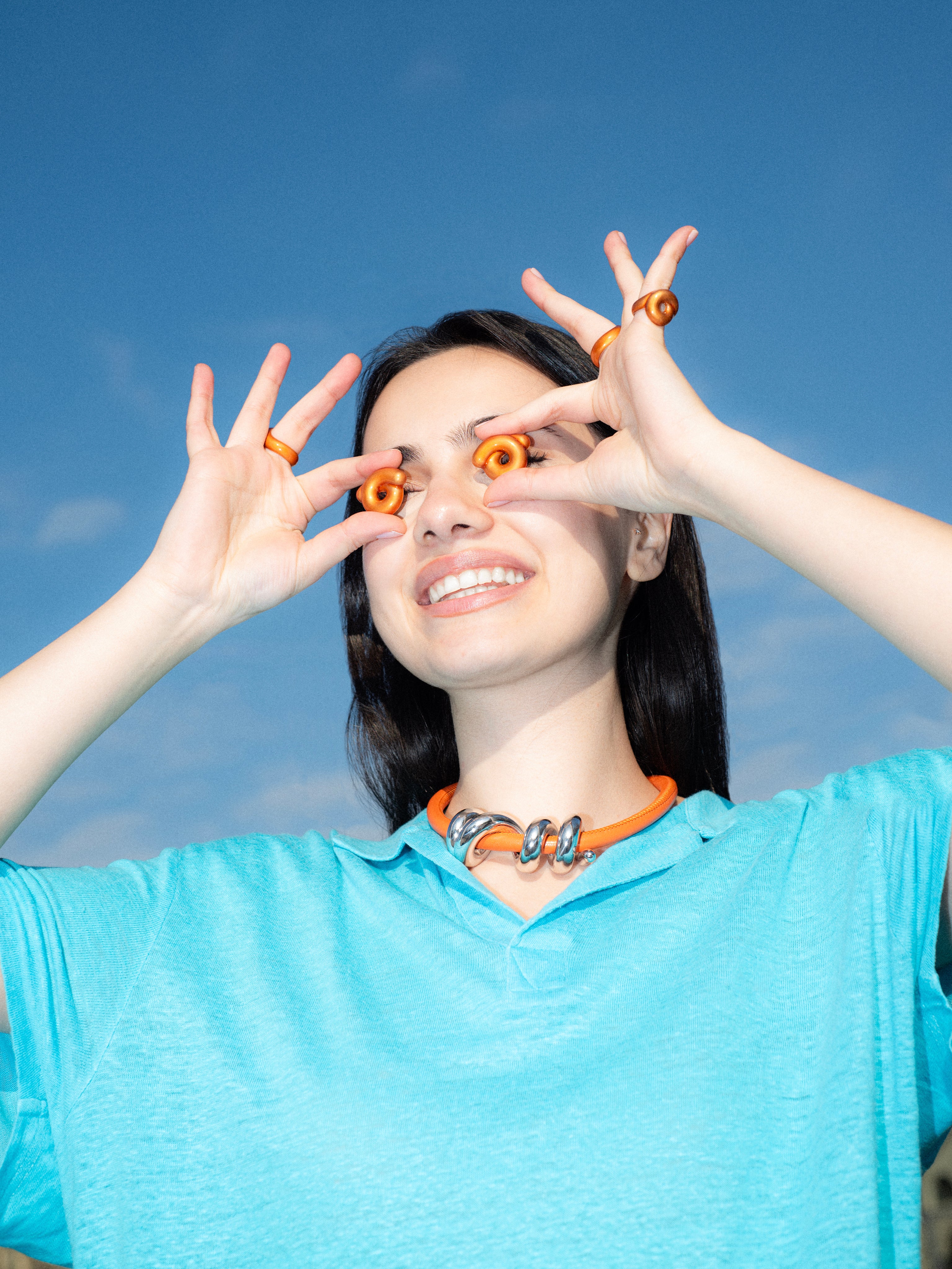 The Tarallo collection reinterprets Bea’s childhood nostalgia with larger-than-life, organic shapes that hug the body as gently and gracefully as her grandmother’s love embraced her and her family. Each piece features glossy, hand-painted enamel on a sterling silver base, creating sculptural jewelry that feels both modern and sentimental. This collection exemplifies Bea’s passion for soft, flowing forms and her commitment to vibrant, joyful color palettes.