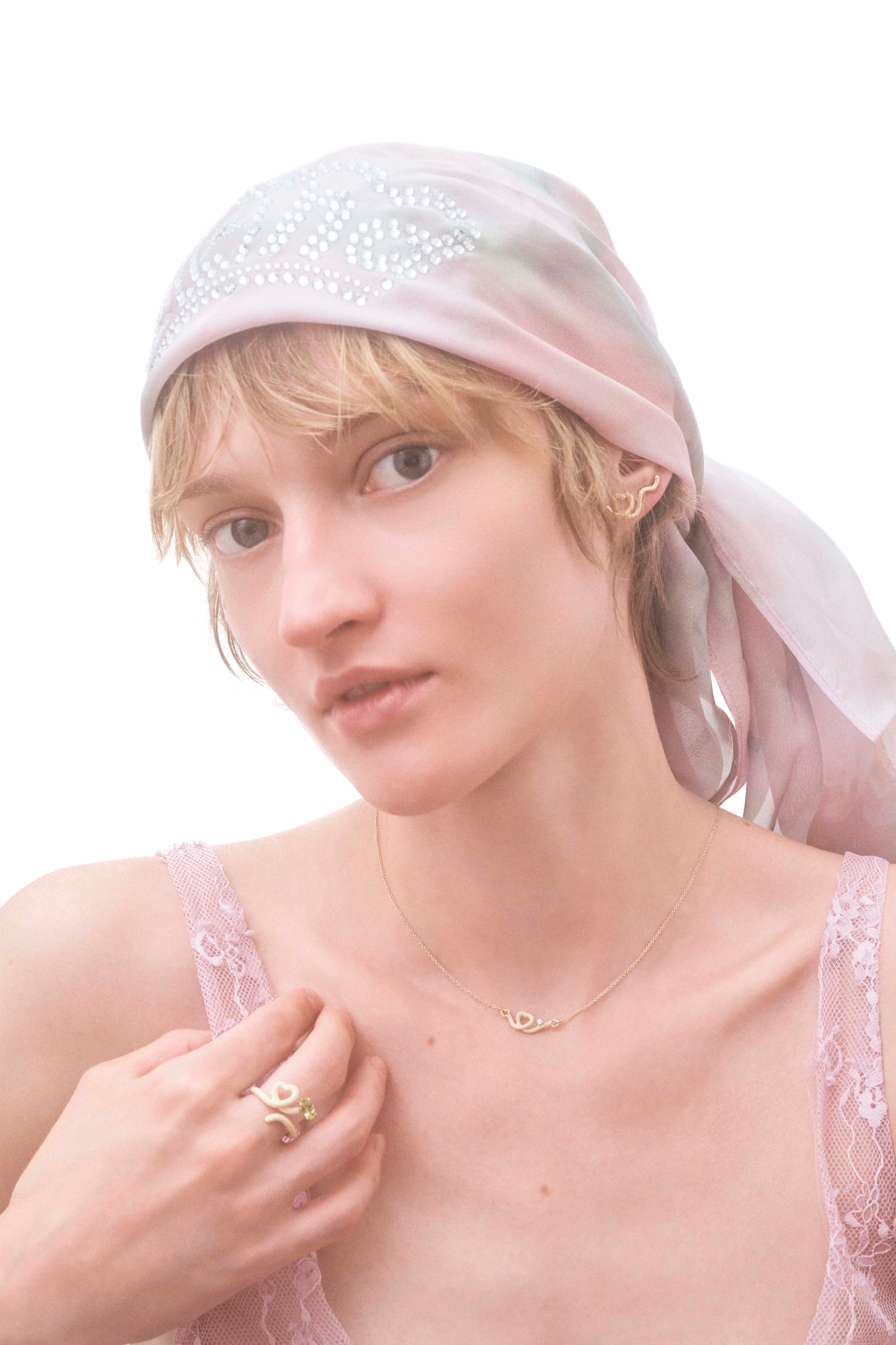 Baby Vine Heart Ring crafted in gold and silver, adorned with hand-painted panna enamel. The design features a delicate heart shape on the vine curl, complemented by a stunning marquise-cut peridot.