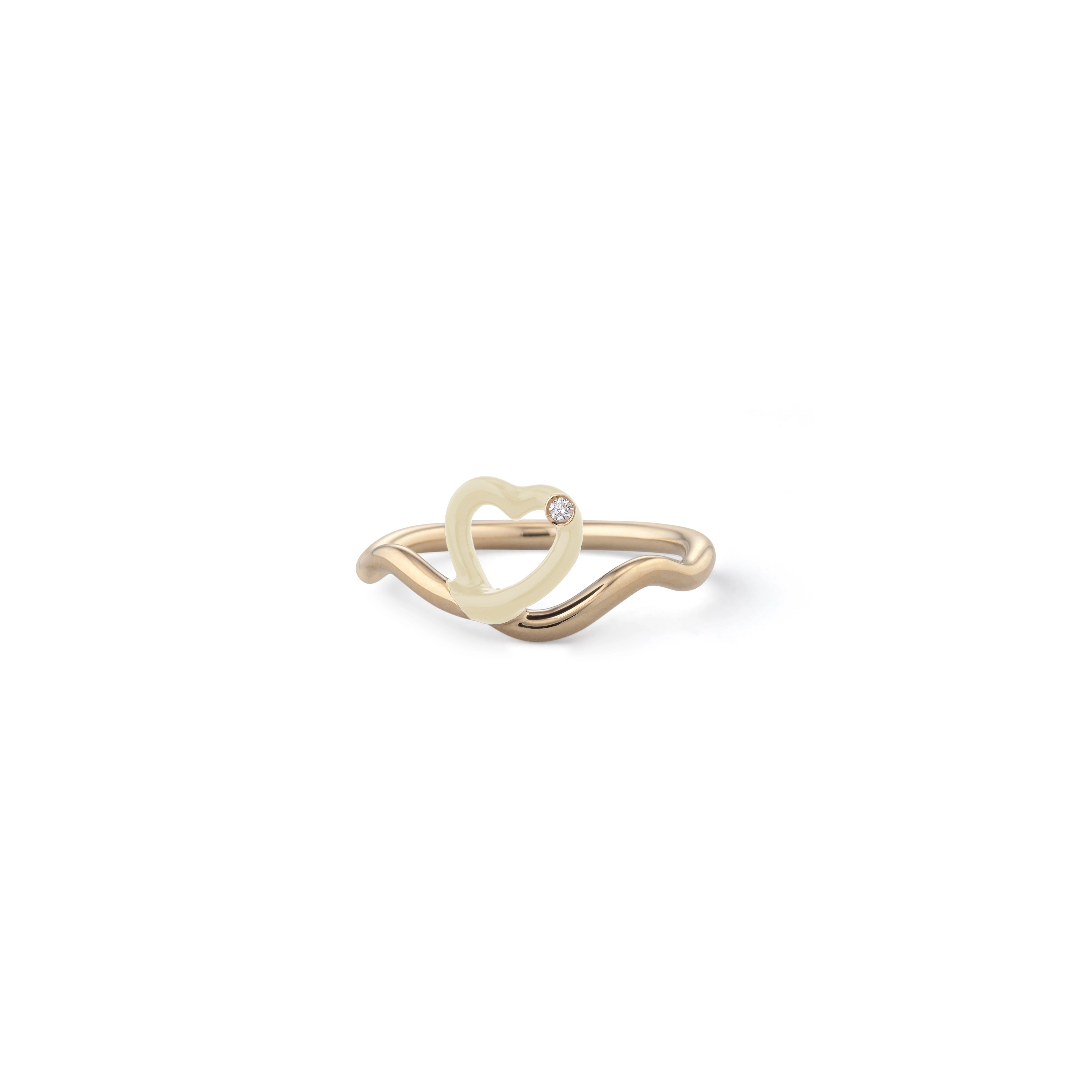 Gold ring featuring a heart-shaped design, hand-painted with panna enamel, and accented with a round-cut diamond set at the corner of the heart.