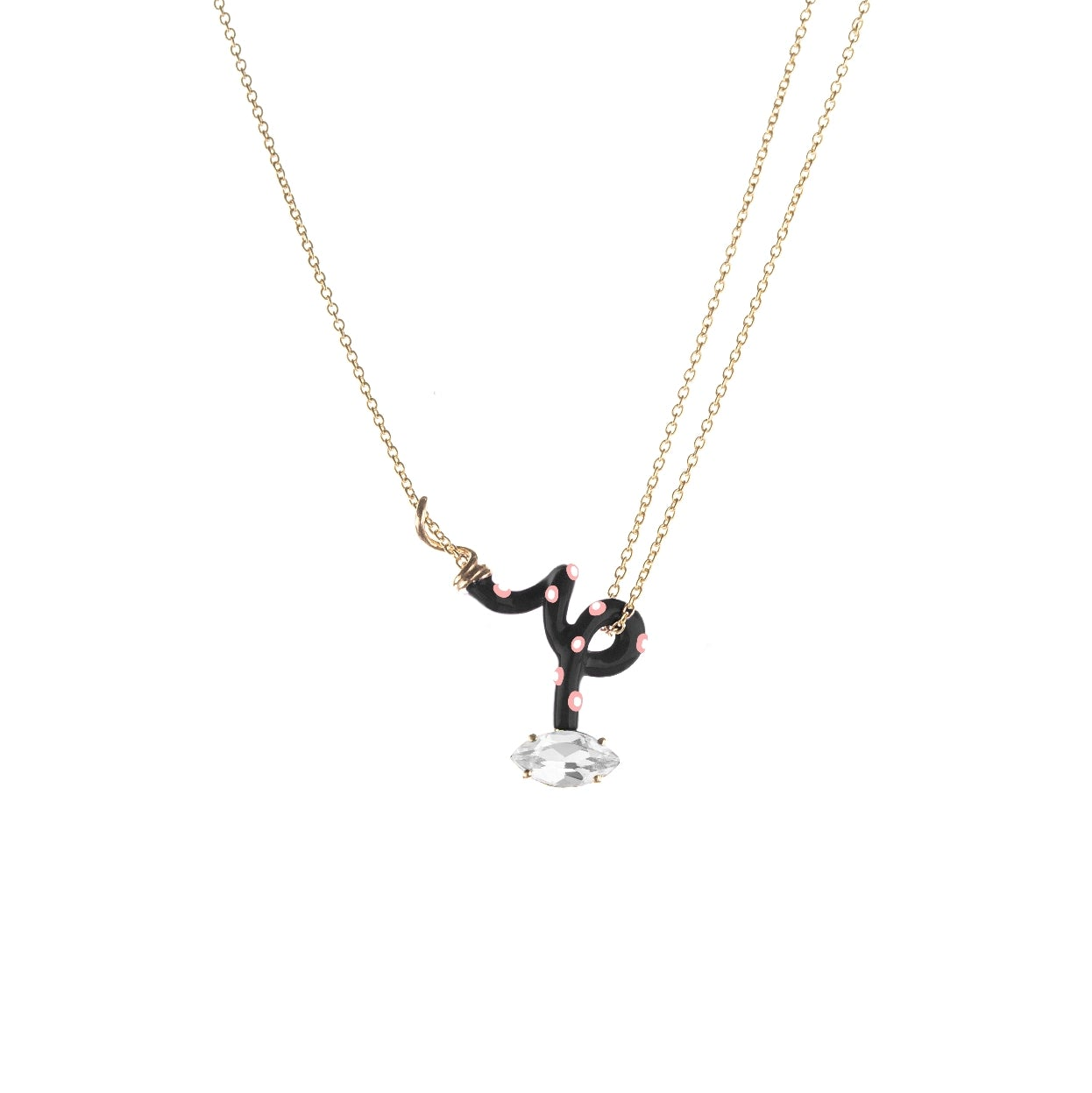 Baby Vine Curl Pendant in 9kt yellow gold and silver, featuring a black enameled vine and a marquise-cut rock crystal.