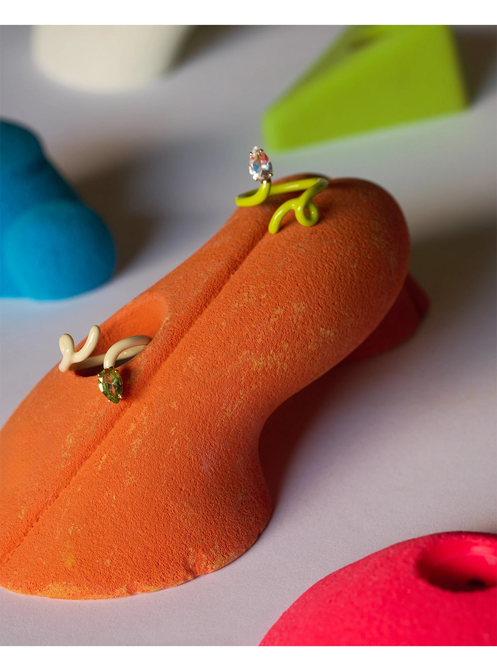 Baby vine tendril ring in yellow gold and silver, featuring hand-painted panna enamel and a drop-cut peridot crystal.