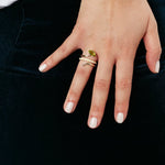 Long vine ring in yellow gold, featuring hand-painted enamel in the center and a marquise-cut peridot.