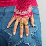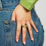 Looped vine tendril ring in yellow gold and silver, featuring hand-painted pistacchio enamel and a marquise-cut amethyst.