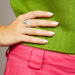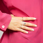 Looped vine tendril ring in yellow gold and silver, featuring hand-painted white enamel and a drop-cut Topaz.