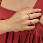 Multi frequency ring in yellow gold with baby blue, lavender and light pink enamel.