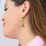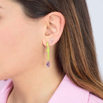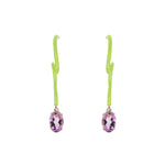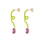 Oval vine pendant earrings in yellow gold, featuring lime green enamel and oval-cut amethyst.