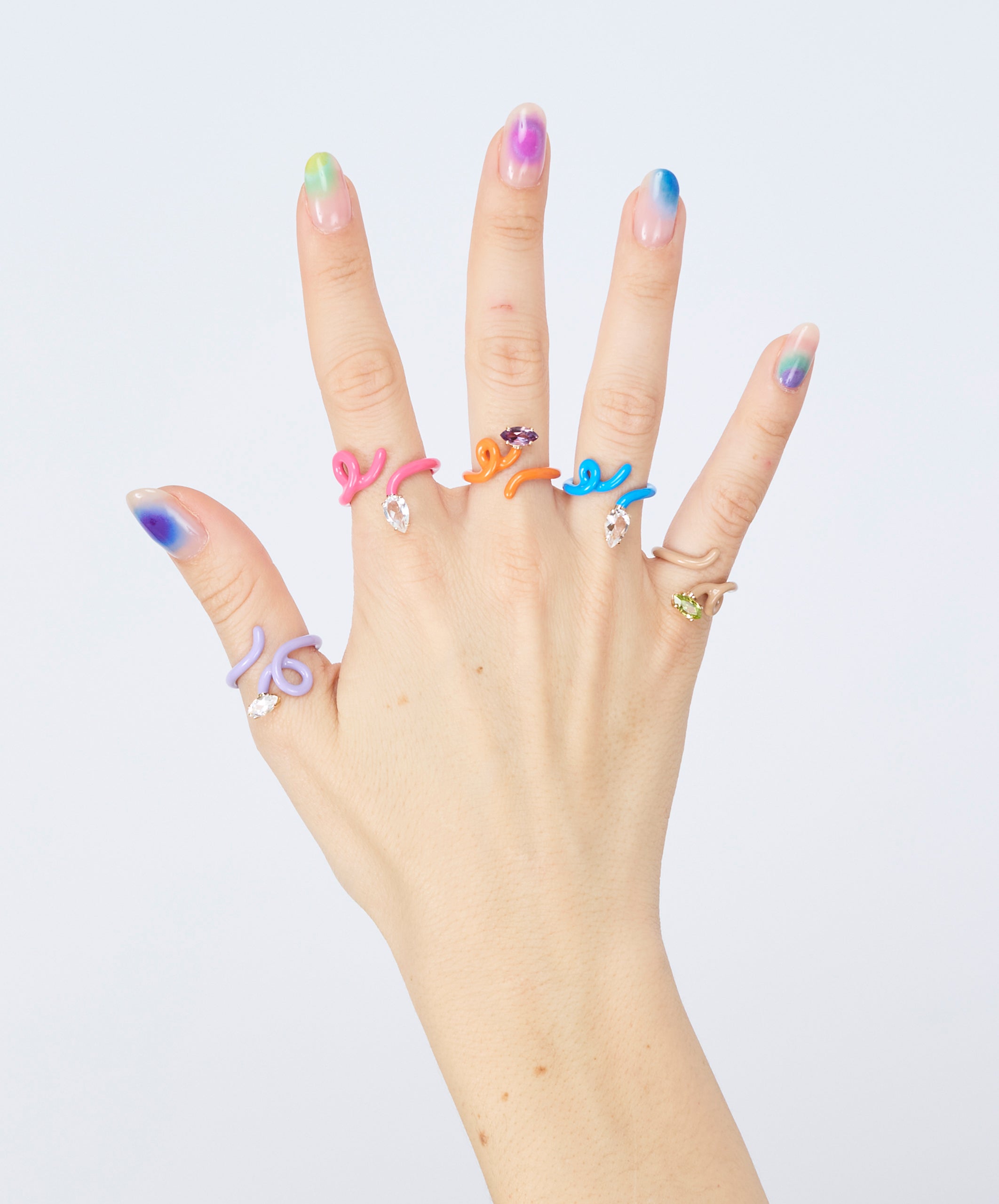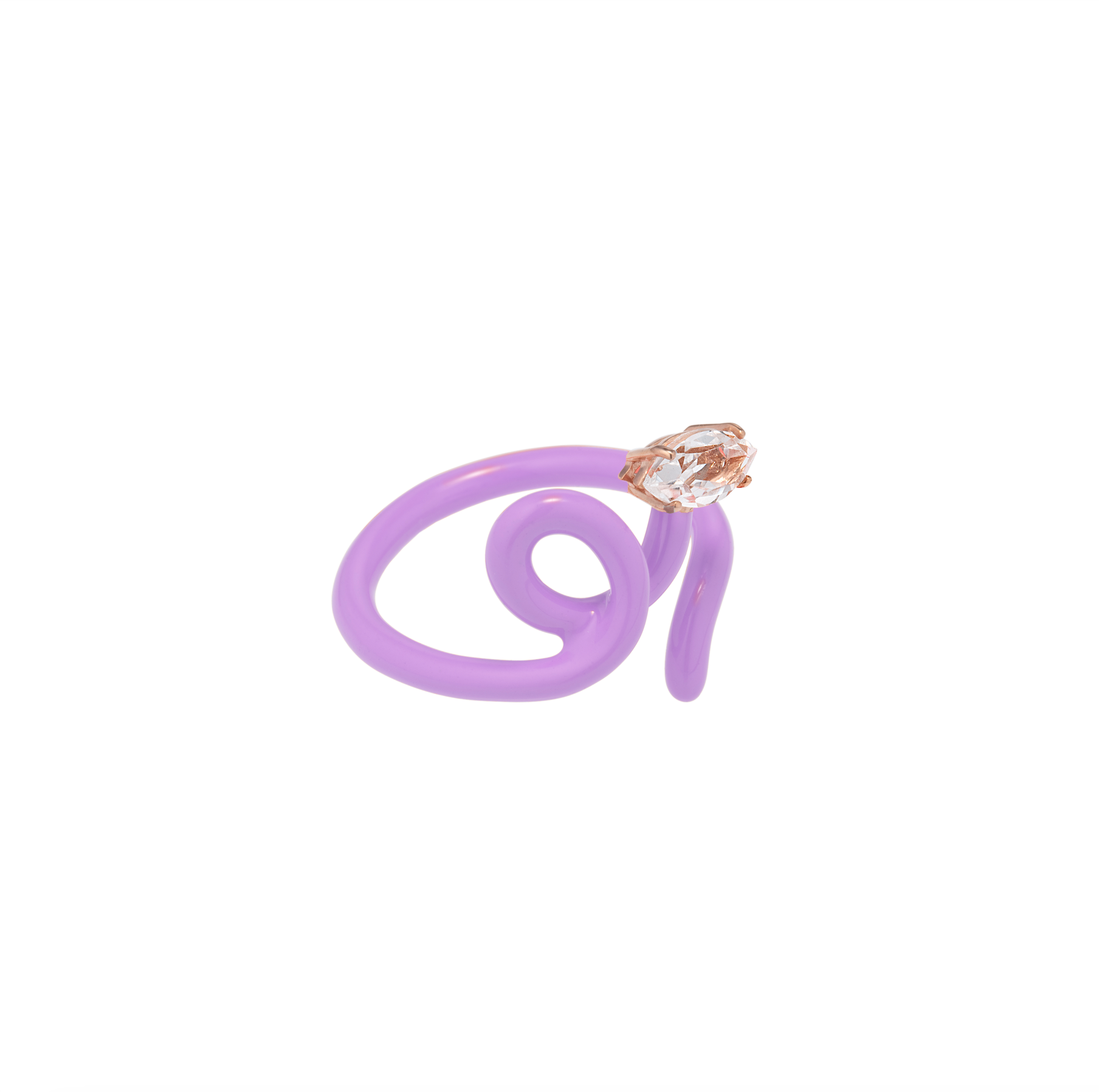 Baby vine tendril ring in yellow gold and silver, featuring hand-painted lavender enamel and a marquise-cut rock crystal.